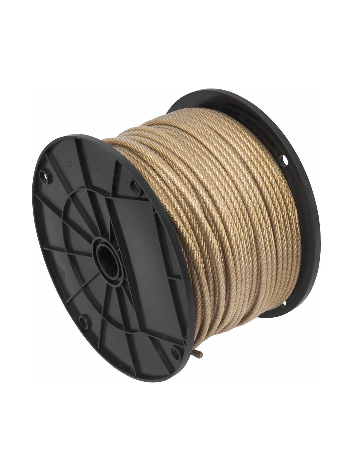 Стальной трос Gigant 5/6мм в ПВХ оплетке 100м GSC-010 предназначен для организации подвесок и растяжек при установке антенн, прокладке уличных кабелей, при строительных работах, в быту и садоводстве. Сохранение эксплуатационных качеств в течение длительного срока обеспечено устойчивостью покрытия к воздействию агрессивных сред. Трос не предназначен для подъема и перемещения грузов. Благодаря ПВХ оплетке удается значительно повысить срок службы изделия, обеспечивая его герметичность и защиту от коррозии. Поставляется на катушке для удобства хранения и перемещения. Рабочая прочность: 2.29 кН Разрывная прочность: 13.77 кН Конструкция троса: 6X7+FC Вес: 9,8 кг Диаметр стальной части троса 5 мм, с учетом оплетки 6 мм.
