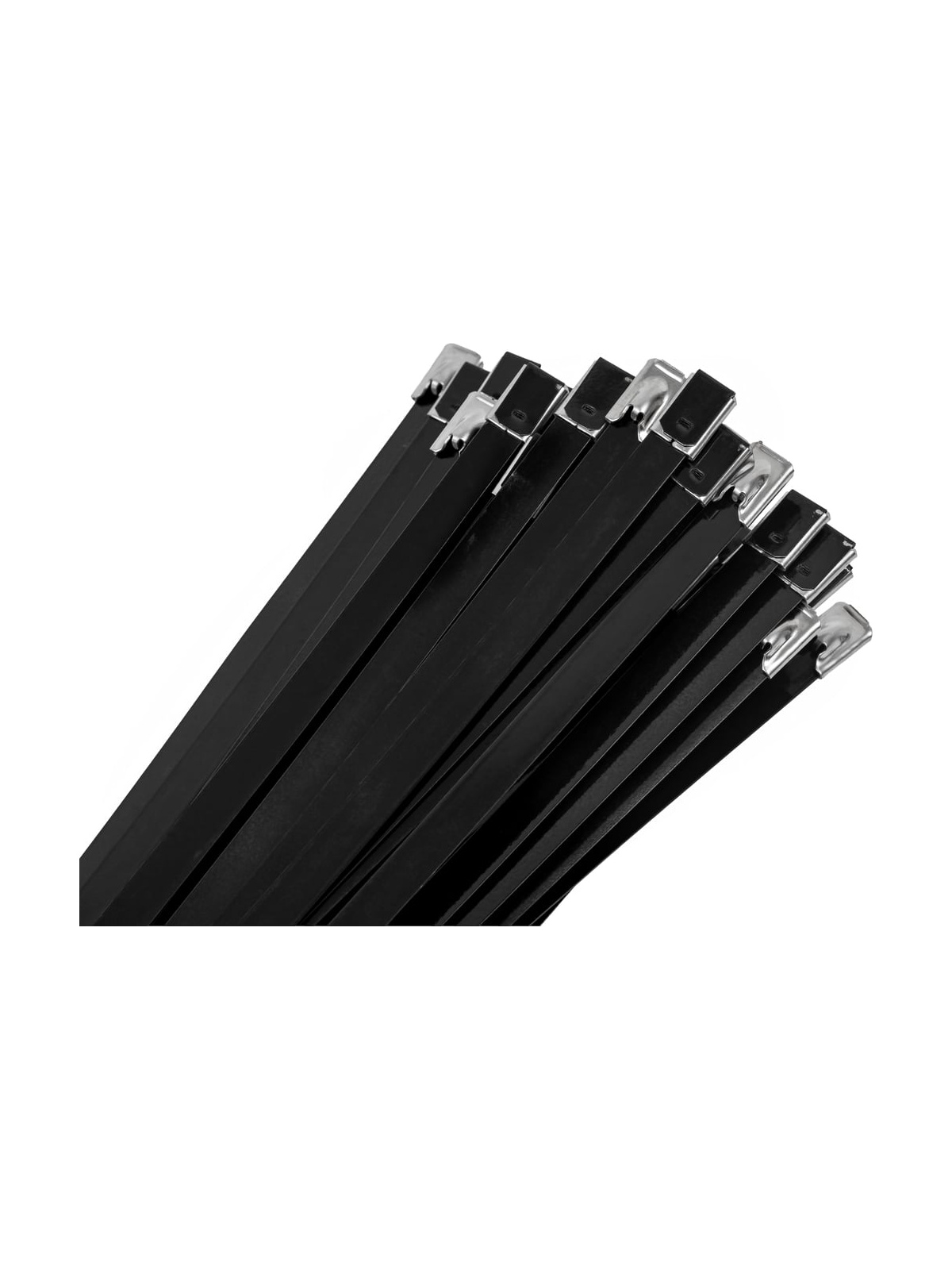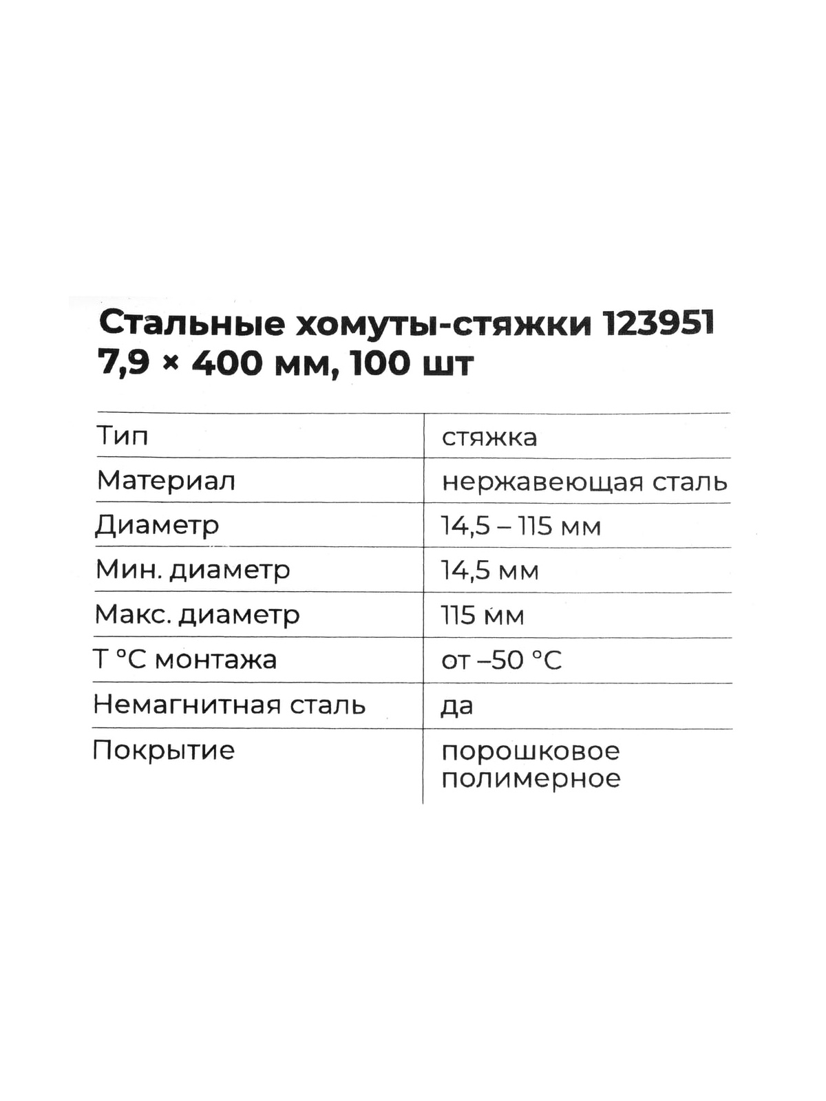 Стальные хомуты-стяжки Gigant нерж. с полимерным покрытием 7,9x400мм 100шт. 123951 представляют собой надежное решение для крепления и фиксации различных элементов. Они предназначены для работы в агрессивных условиях, при повышенной вибрации, влажности, радиации и экстремальных перепадах температур. Стальной хомут служит альтернативой металлической ленте и легко справляется с задачами, которые невозможно решить с помощью нейлоновой стяжки. Он изготовлен из нержавеющей стали AISI 304, которая обладает высокой прочностью, долговечностью, не подвержен коррозии и имеет огнестойкость, что делает его подходящим для монтажа огнестойких кабельных линий (ОКЛ). Полимерное покрытие повышает антикоррозийную стойкость, сглаживает края стяжки и создаёт изолирующий слой, предотвращающий химическую коррозию между разнородными металлами.