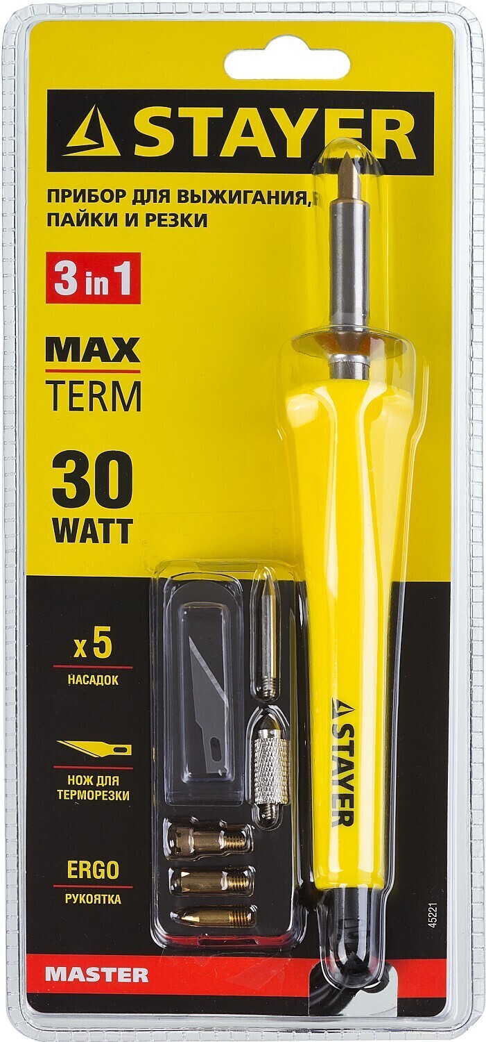 -Мощность: 30 Вт -3 в 1: Выжигание, пайка, резка -Доплонительные насадки: 7 шт -Температура жала: 520 °C