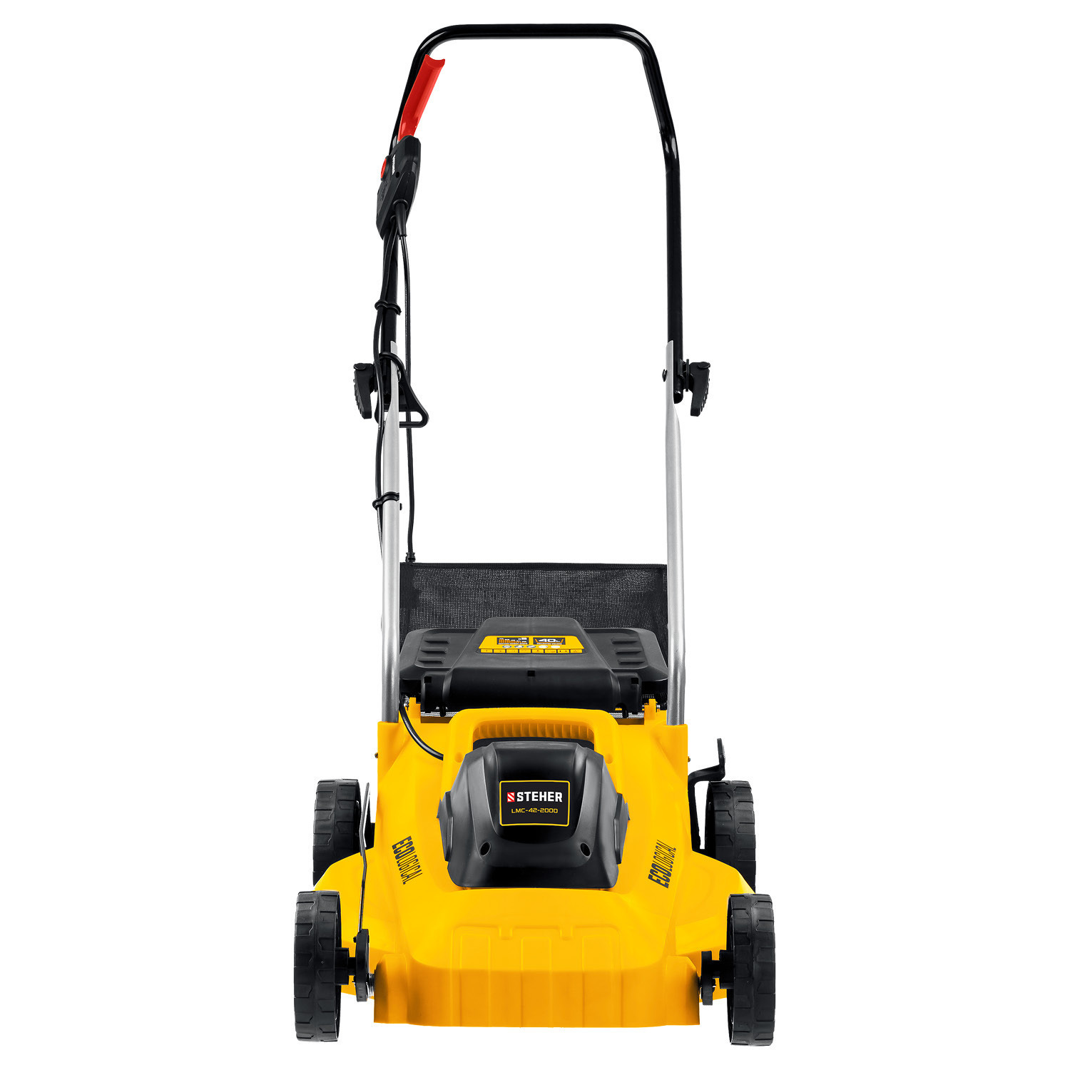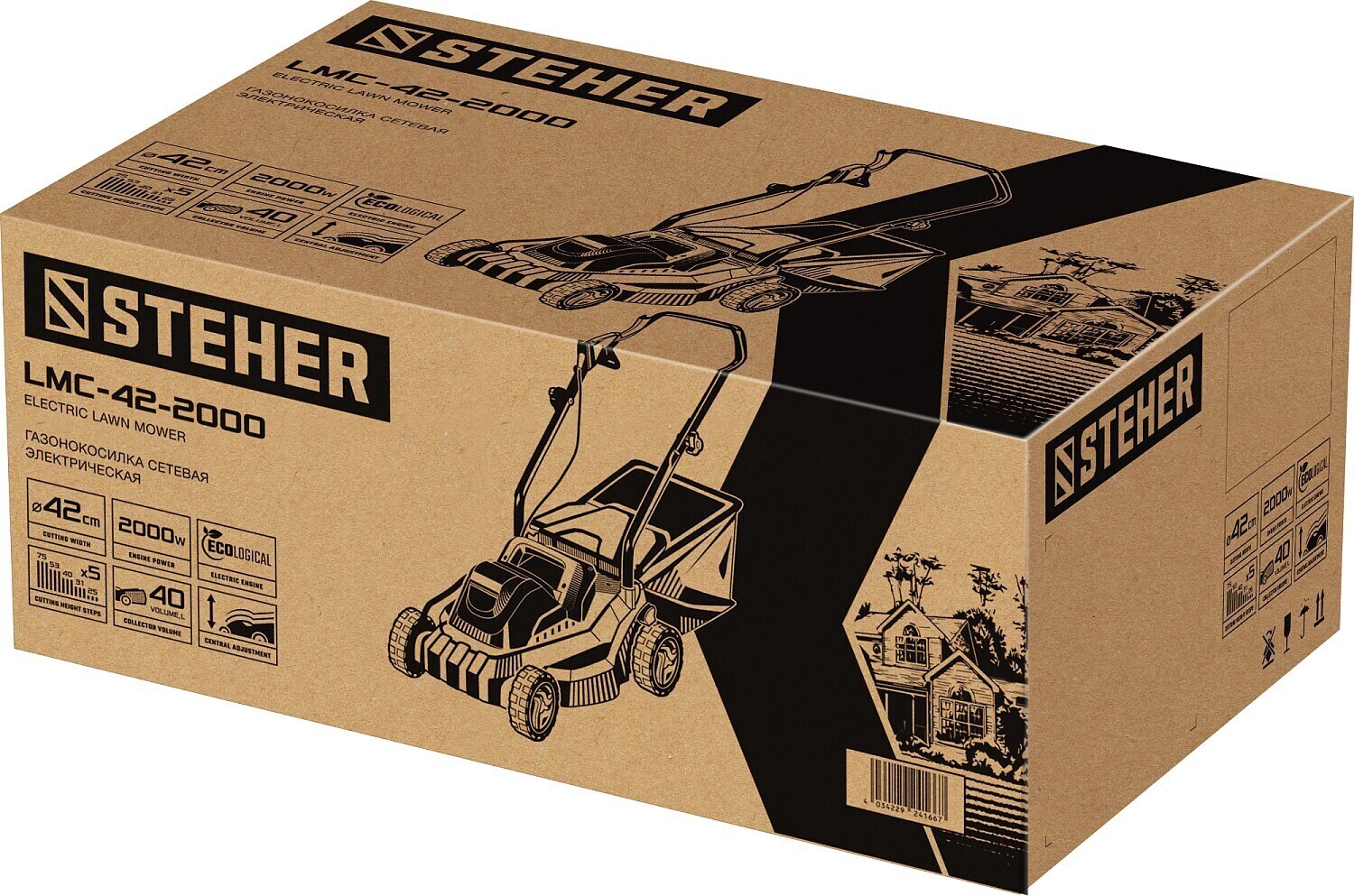 -Мощность двигатея: 2000 Вт -Частота вращения шпиндея: 3200 об/мин -Ширина скашивания: 420 мм -Мин. высота скашивания: 25 мм -Макс. высота скашивания: 75 мм -Количество ступеней регулировки: 5 -Регулировка высоты кошения: центральная -Травосборник: есть -Объем травосборника: 40 л -Тип травосборника: мягкий -Мульчирование: нет -Выброс травы: назад -Самостоятельное движение: нет -Материал корпуса: пластик -Тип рукоятки: складная -Напряжение: 220±10% /50 В/Гц -Габариты: 72x48x29 см -Масса изделия: 11 кг -Масса в упаковке: 14 кг