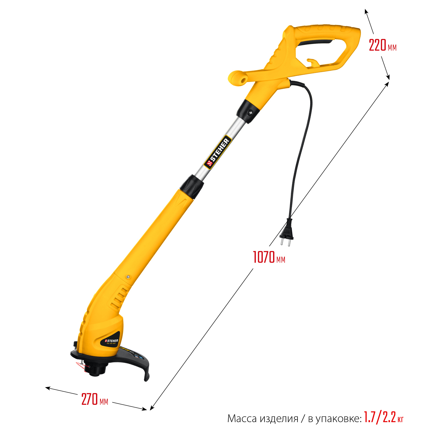 -Мощность: 400 Вт -Частота вращения шпинделя: 11500 об/мин -Режущий элемент: леска -Ширина скашивания (леска): 25 см -Ширина скашивания (нож): - см -Толщина лески: 1,2 мм -Тип катушки: полуавтоматическая -Тип рукоятки: T-образная -Тип штанги: телескопическая -Ремень: нет -Напряжение питания: 230 / 50 В/Гц -Габариты: 51x20x13 см -Масса изделия: 2 кг -Масса в упаковке: 2,6 кг