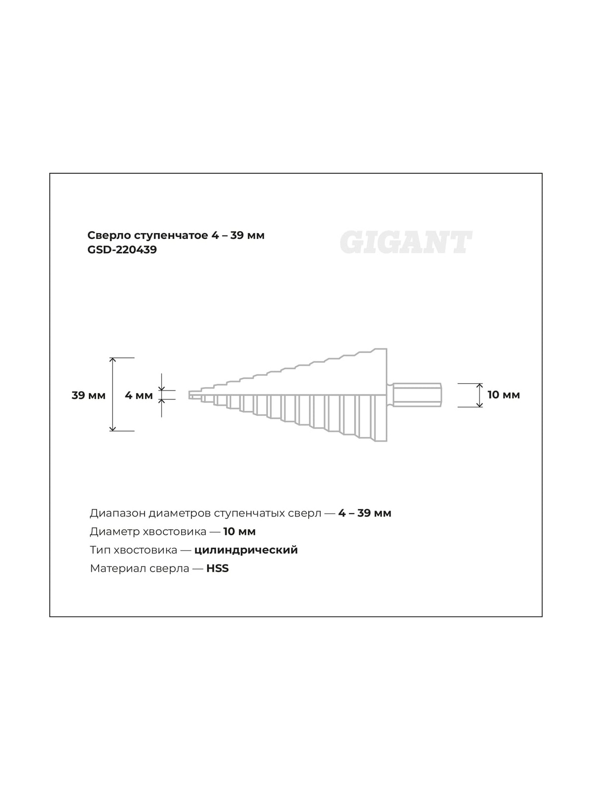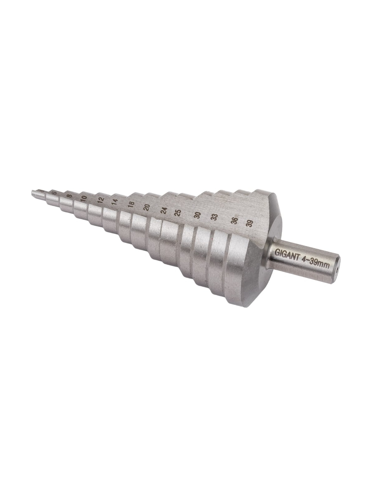 Ступенчатое сверло 4-39 мм Gigant GSD-220439 выполнено из быстрорежущей стали. Диаметр ступеней – 4, 6, 8, 10, 12, 14, 18, 20, 24, 25, 30, 33, 36, 39 мм; Высота ступени – 6 мм.