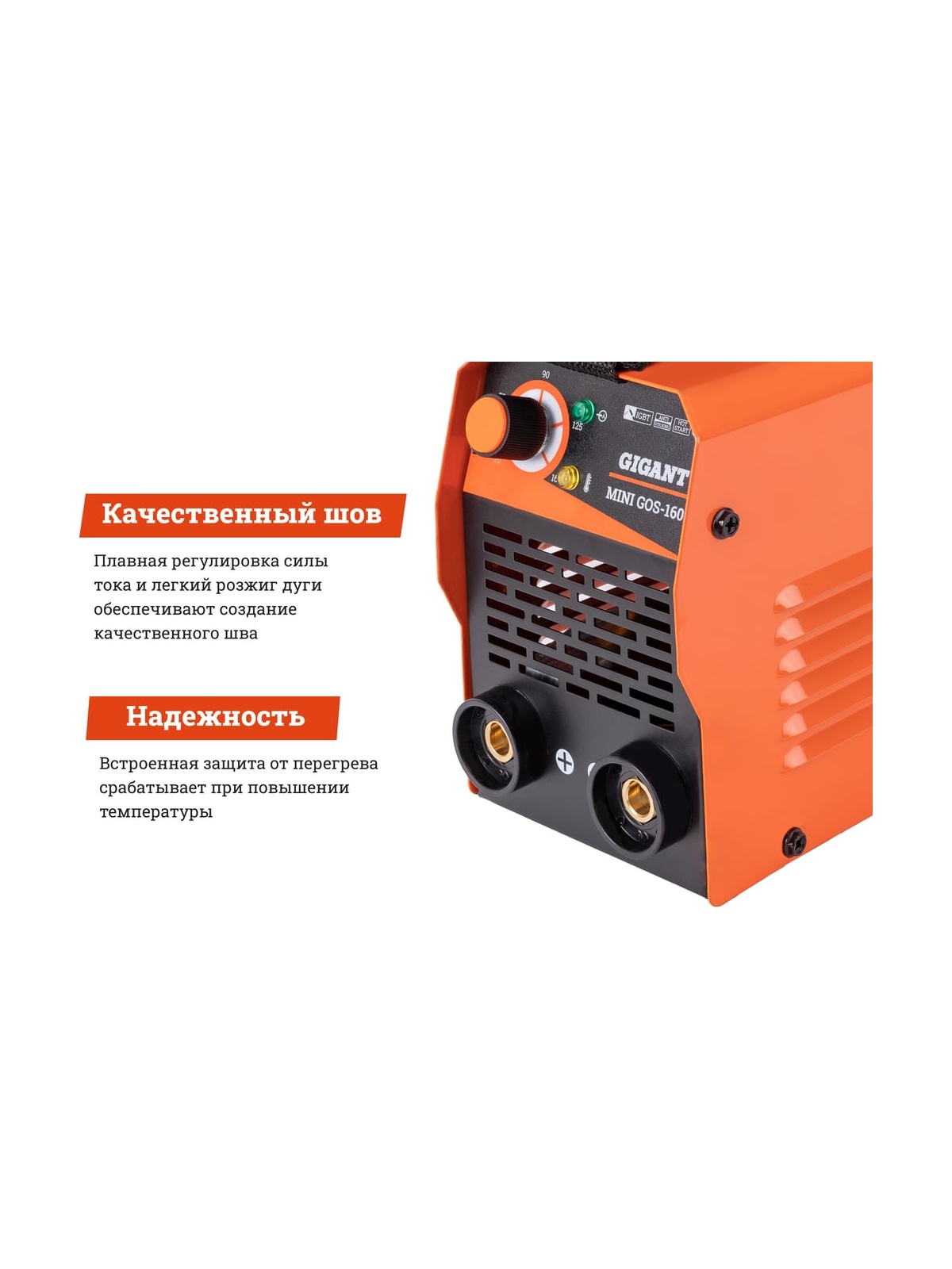 Сварочный инвертор Gigant MMA MINI GOS-160 представляет собой мобильное оборудование, которое служит для соединения покрытыми штучными электродами деталей стальных металлоконструкций. Прочный корпус защищает внутренние элементы от повреждений при случайных механических воздействиях. Разъемы обеспечивают возможность легко и быстрого подключить кабели без использования каких-либо инструментов. Модель отличается простотой управления и не требует сложного технического обслуживания.