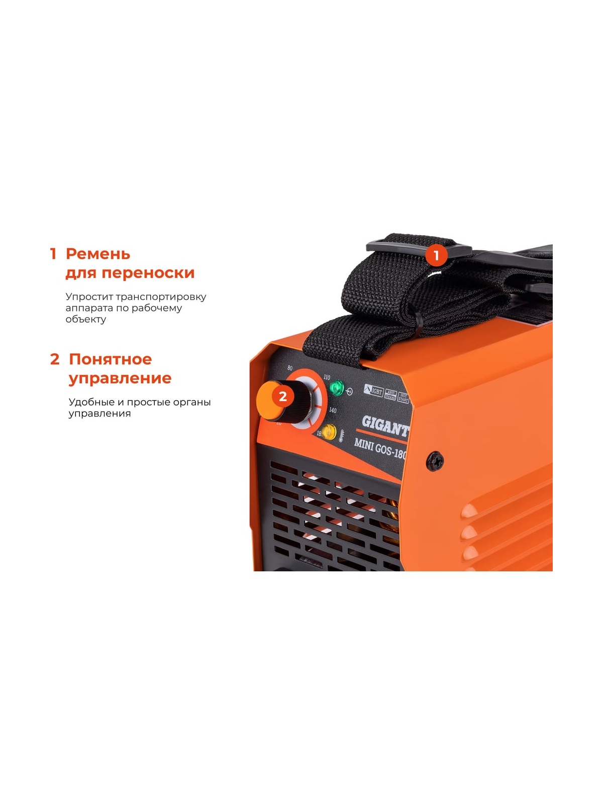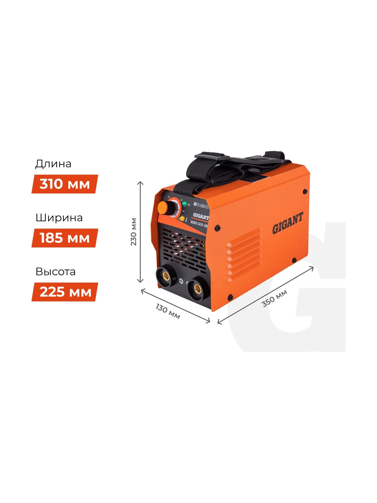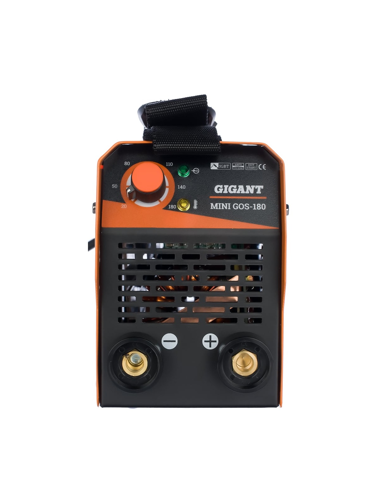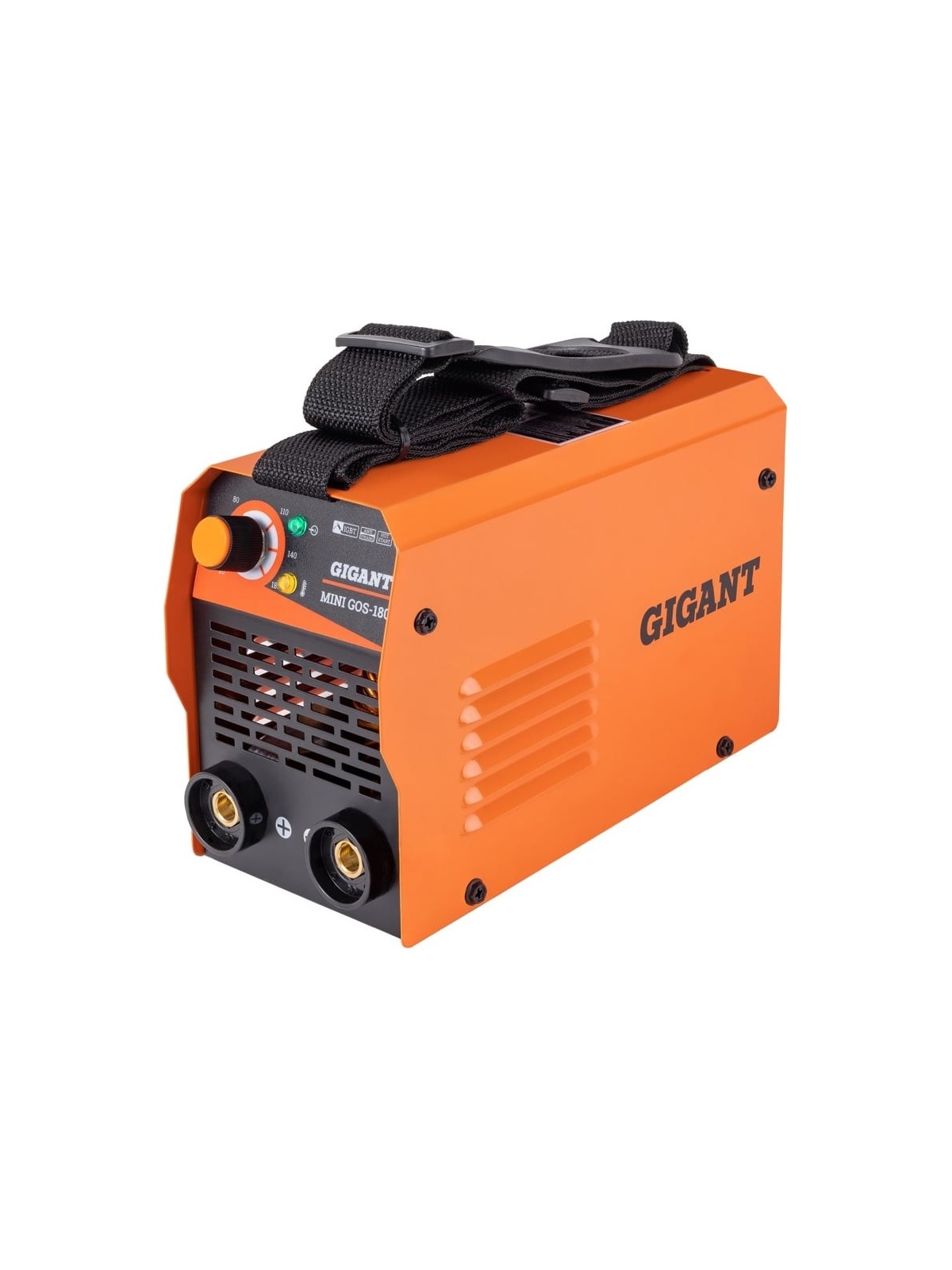 Сварочный инвертор Gigant MMA MINI GOS-180 представляет собой мобильное оборудование, которое служит для соединения покрытыми штучными электродами деталей стальных металлоконструкций. Благодаря ручке сверху корпуса транспортировка модели с одного рабочего места на другое осуществляется легко и удобно. Небольшие габариты и вес дают возможность хранить агрегат в весьма стесненных условиях. Байонетные разъемы позволяют легко и быстрого подключить кабели без использования каких-либо инструментов.