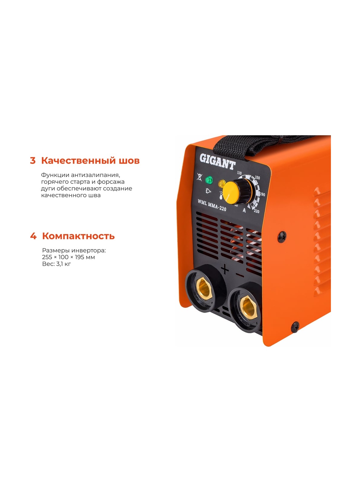 Сварочный инвертор Gigant WML MMA-220подойдет для работы на строительной площадке, в домашних условиях и при выполнении текущих ремонтных работ. Оборудование обладает прочным корпусом и невысоким уровнем шума. Это повышает комфорт эксплуатации. Устройство имеет продолжительный период включения, что обеспечивает высокую скорость работы. Имеет компактные размеры.
