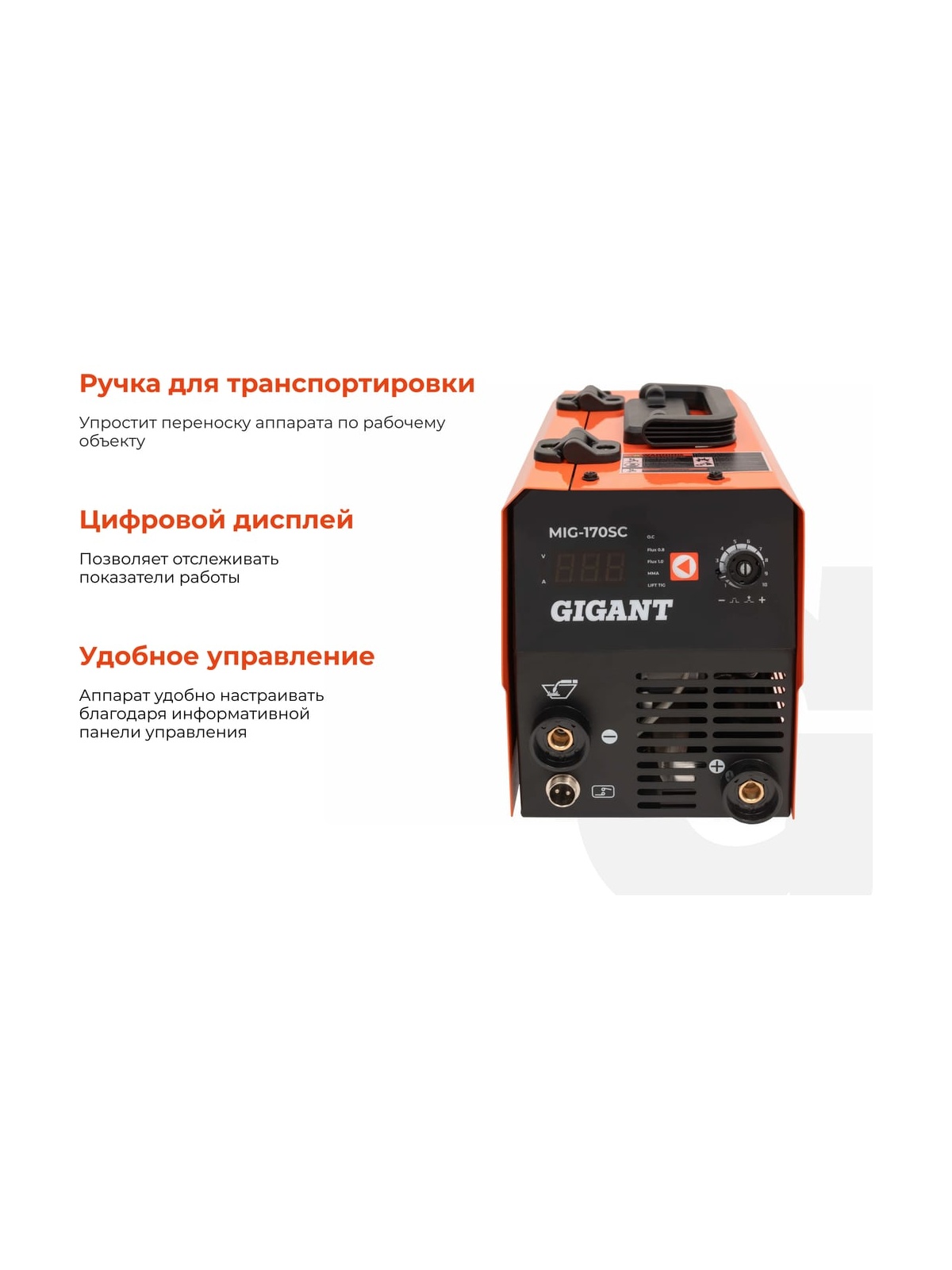 Сварочный полуавтомат - инвертор Gigant MIG-170SС - универсальный аппарат, который можно использовать для полуавтоматической сварки порошковой проволокой 0.8-1.0 мм (СВАРКА БЕЗ ГАЗА), ручной дуговой сварки штучным электродом от 1.6 до 4.0 мм, аргонодуговой сварки (вентильную горелку необходимо приобретать отдельно).
