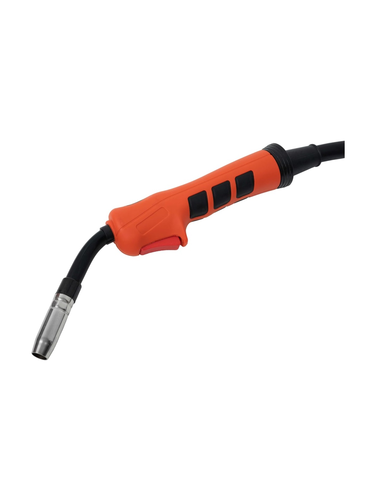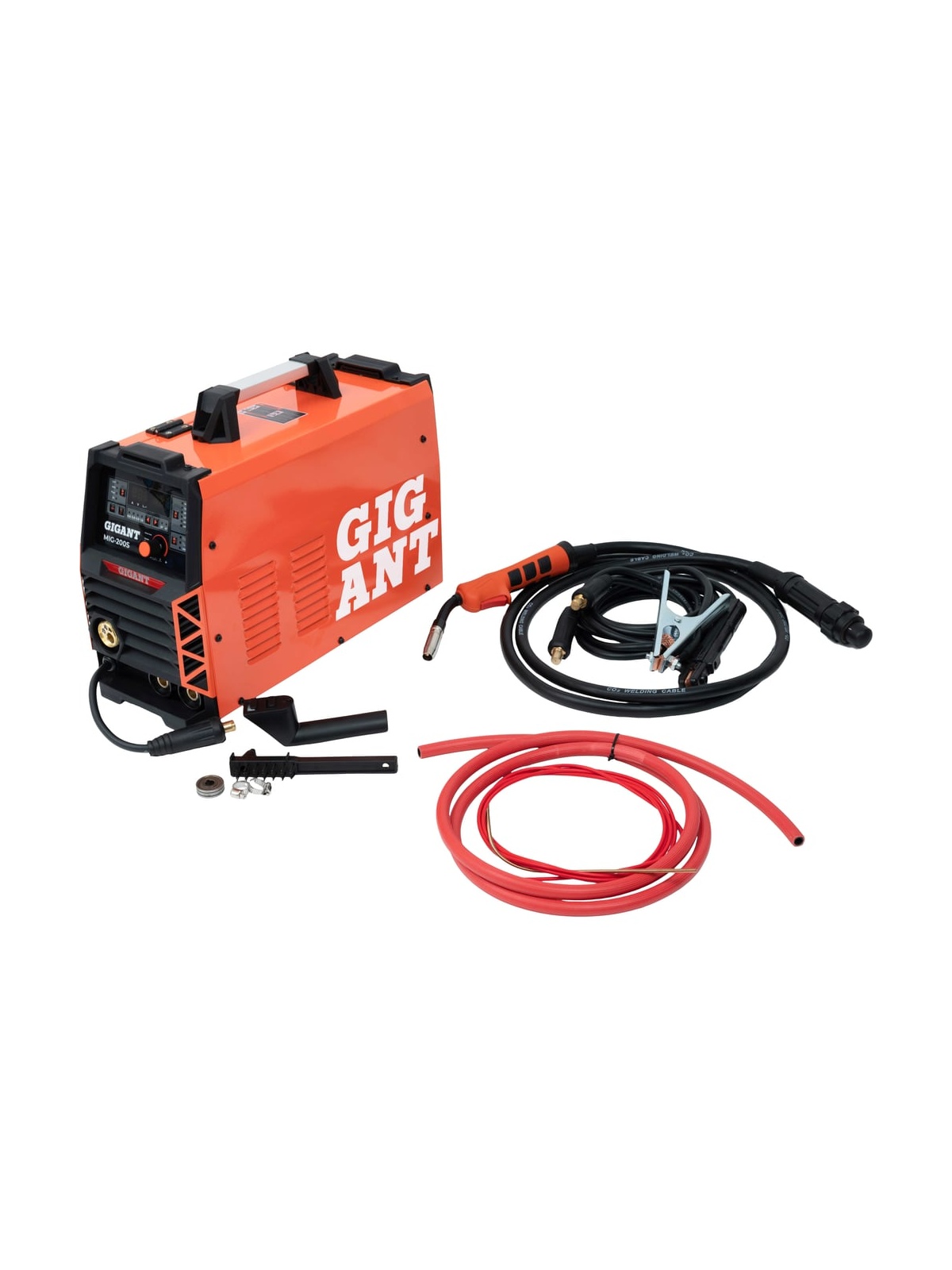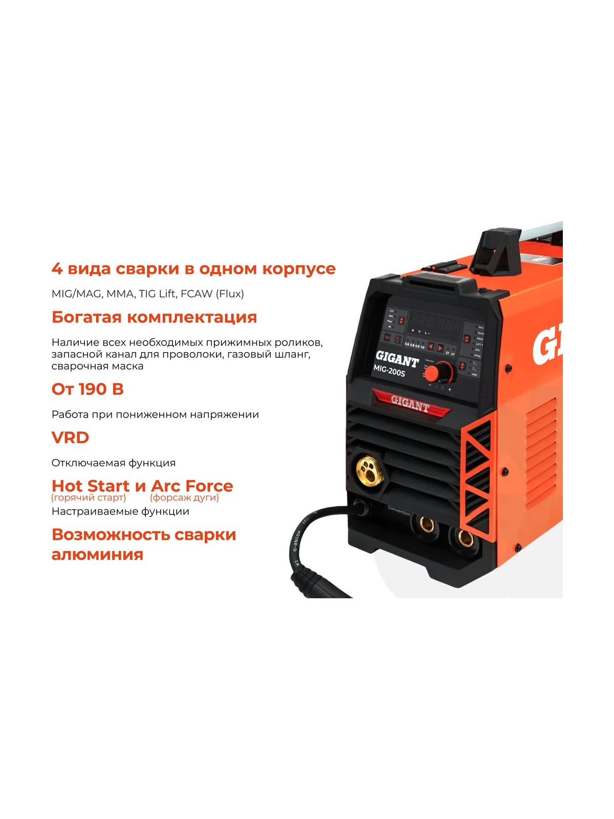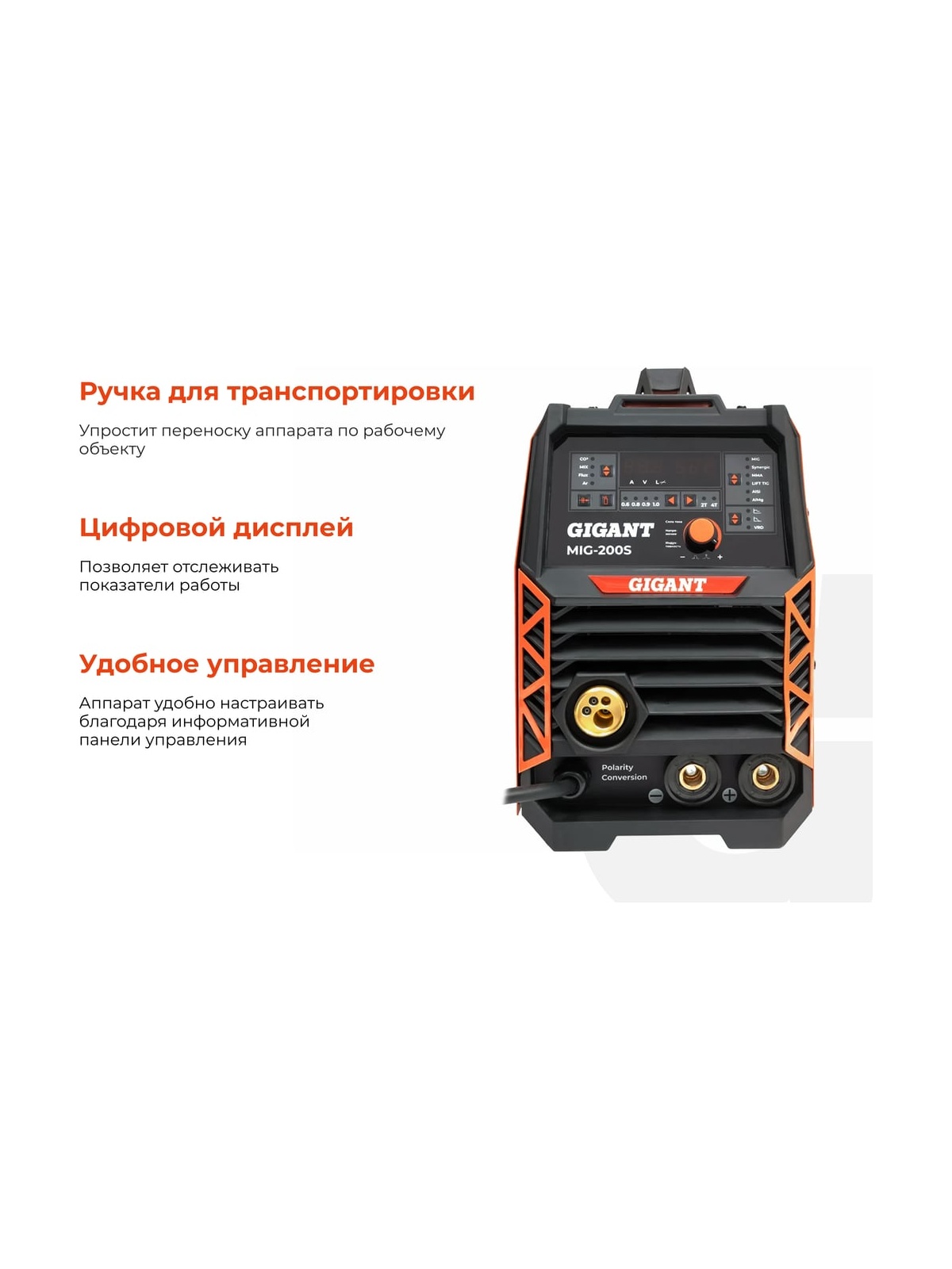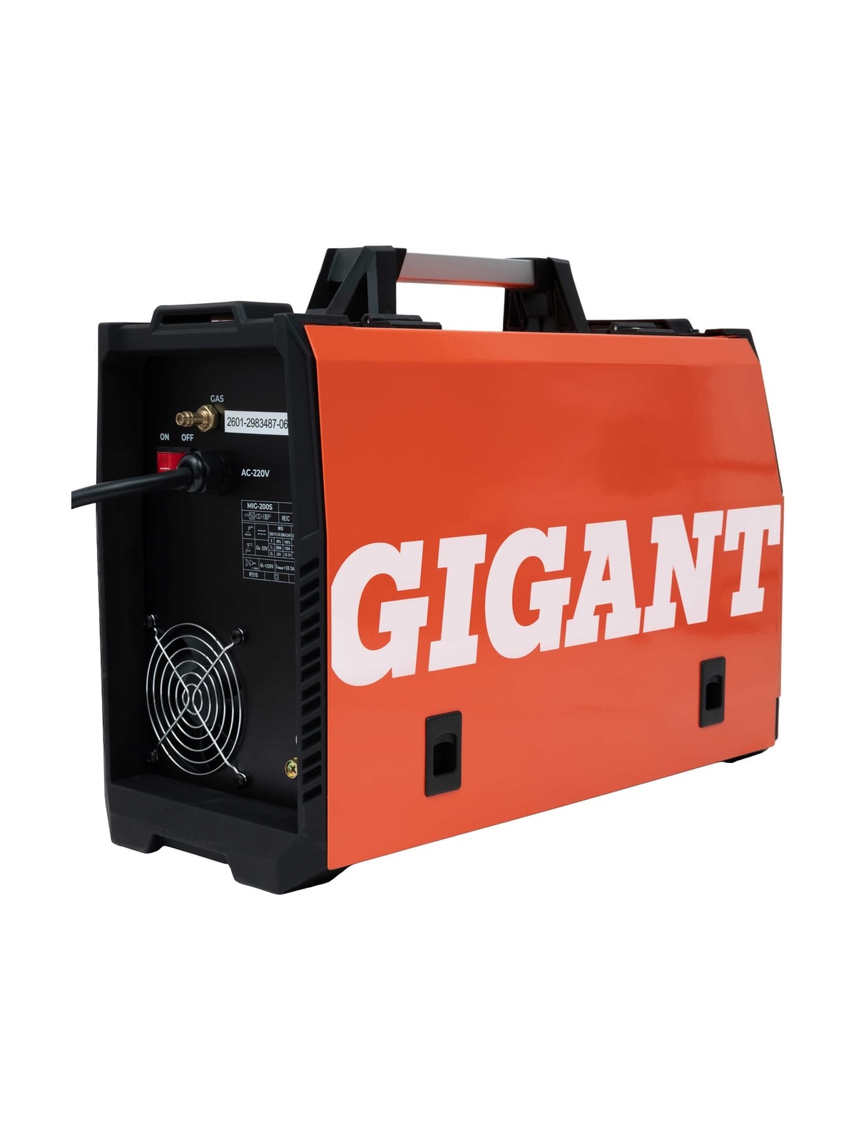 Сварочный полуавтомат - инвертор Gigant MIG-200S оснащен синергетической панелью управления, которая позволяет за счет единственного регулятора подобрать оптимальные параметры для сварки определенного типа металла при известной толщине. Модель подойдет для работы с штучными электродами. Размеры корпуса и надежная система охлаждения позволяет эффективно работать в течение продолжительного периода времени. На данном аппарате есть возможность варить алюминий. Для этого необходимо заменить кабель канал в горелке на тефлоновый, установить U-образный ролик для сварочной проволоки и использовать в качестве защитного газа Аргон.