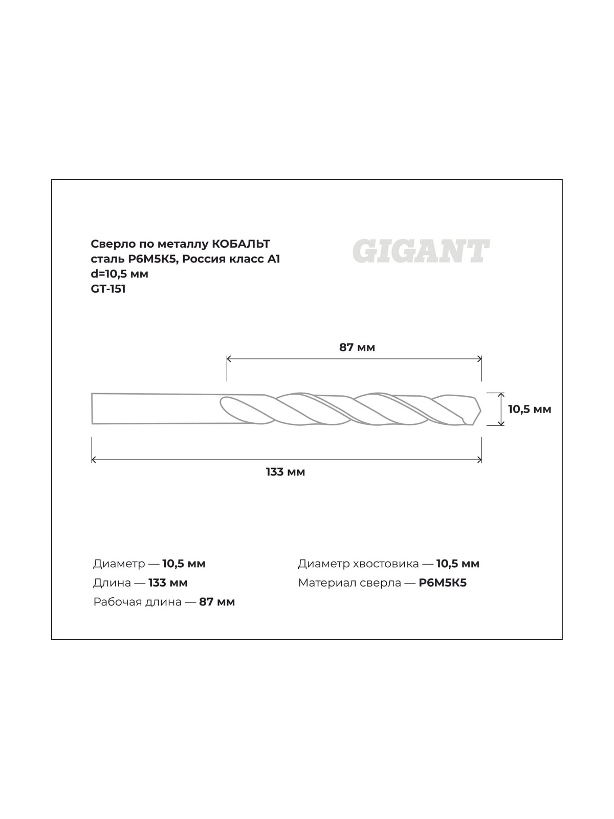 Сверло по металлу КОБАЛЬТ (10.5х87х133 мм; Р6М5К5; класс А1) Gigant GT-151 предназначено для выполнения сквозных/глухих отверстий в металлических заготовках из легированной, углеродистой, нержавеющей, труднообрабатываемой стали, цветных металлах, сером чугуне и пластмассе. Изготовлено из быстрорежущей инструментальной стали с добавлением 5% кобальта для повышения термостойкости и износостойкости. Обладает повышенной производительностью, имеет оптимальные углы заточки и выполнено из высококачественных быстрорежущих сталей по специальной технологии. Оснастка имеет цилиндрический хвостовик. Работает в правом направлении. Продукция представлена профессиональными и бытовыми инструментами, имеет доступную цену и высокое качество. При изготовлении товаров Gigant используется современное оборудование и прочные материалы. Производство осуществляется на современных предприятиях России и Азии. Тестирование товаров осуществляется в два этапа, каждая партия инструментов проходит проверку на соответствие стандартам и заявленным техническим характеристикам. Это является залогом качества и надежности готового продукта. Продукция представлена широкой линейкой инструментов. У нас можно приобрести ручной инструмент, строительный, садовый, сантехнический, климатический, крепежный, автогаражный, а также станки, расходные материалы и многое другое.