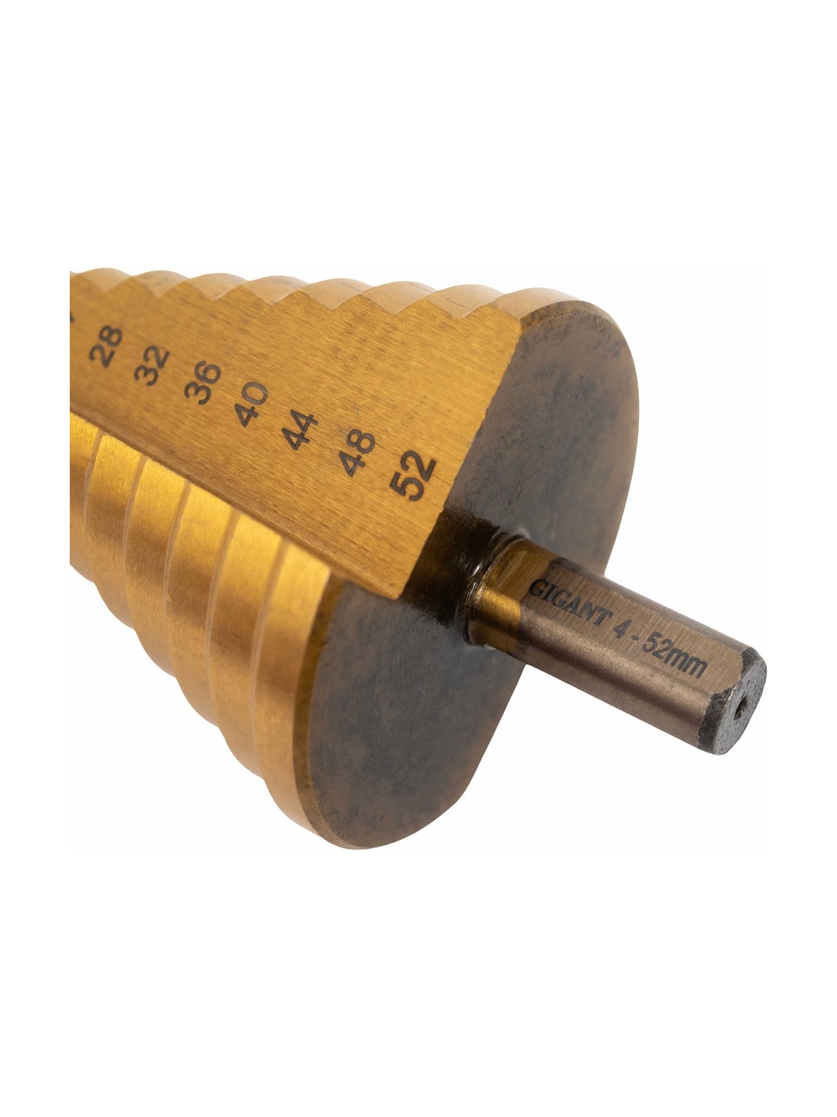 Сверло ступенчатое 4x52мм, шаг 4, HSS Gigant GSD 11059 предназначено для сверления отверстий в листовых металлических и пластиковых материалах различного диаметра без смены режущего инструмента. На каждой ступени есть маркировка фактического диаметра. Три фаски на хвостовике предотвращают проскальзывания в патроне. Изготовлено из высококачественной быстрорежущей стали P6M5. Покрытие нитридом титана уменьшает перегрев во время сверления и продлевает срок службы сверла. Рекомендуется работать с использованием смазочно-охлаждающих жидкостей.