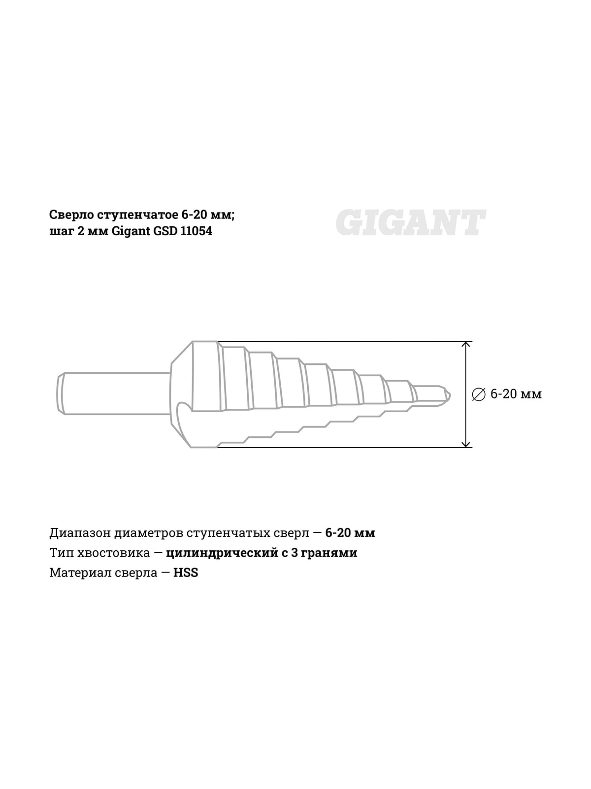 Сверло ступенчатое Gigant GSD 11054 предназначено для получения отверстий различного диаметра без перестановки режущего инструмента. На каждой ступени есть маркировка фактического диаметра. Сверло изготовлено из прочной быстрорежущей HSS стали. Количество ступеней - 8 шт. Диаметр ступеней: 6-8-10-12-14-16-18-20 мм. Сверло имеет цилиндрический тип хвостовика с 3 гранями. Продукция представлена профессиональными и бытовыми инструментами, имеет доступную цену и высокое качество. При изготовлении товаров Gigant используется современное оборудование и прочные материалы. Производство осуществляется на современных предприятиях России и Азии. Тестирование товаров осуществляется в два этапа, каждая партия инструментов проходит проверку на соответствие стандартам и заявленным техническим характеристикам. Это является залогом качества и надежности готового продукта. Продукция представлена широкой линейкой инструментов. У нас можно приобрести ручной инструмент, строительный, садовый, сантехнический, климатический, крепежный, автогаражный, а также станки, расходные материалы и многое другое.