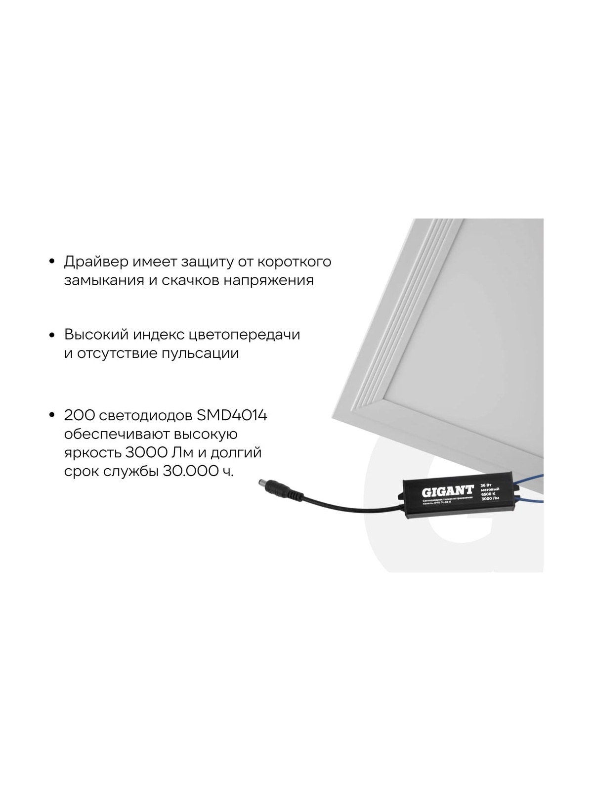 Светодиодная ультратонкая встраиваемая панель Gigant 36Вт матовый 6500K 3000Лм IP40 GL-03-11 используется для основного и дополнительного освещения в офисах, торговых залах, административных зданиях, учебных заведениях и местах общественного питания. Толщина корпуса всего 0,9 мм, это позволяет сэкономить потолочное пространство. Он легко монтируется в любые поверхности - потолки, ниши, колонны. Поставляется в коробке с драйвером в комплекте. Рассеиватель матовый. Преимущества и характеристики: Драйвер имеет защиту от короткого замыкания и скачков напряжения, это гарантирует надежность и безопасность. Высокий индекс цветопередачи и отсутствие пульсации. 200 светодиодов SMD4014 обеспечивают высокую яркость 3000 Лм и долгий срок службы 30.000 ч. Светильник защищен от попадания пыли по стандарту IP40. Универсальный монтаж (встраиваемый, подвесной). Для удобства выведен кабель. Класс энергоэффективности А+ помогает экономить электроэнергию. Температура эксплуатации от -15 до +50 С.