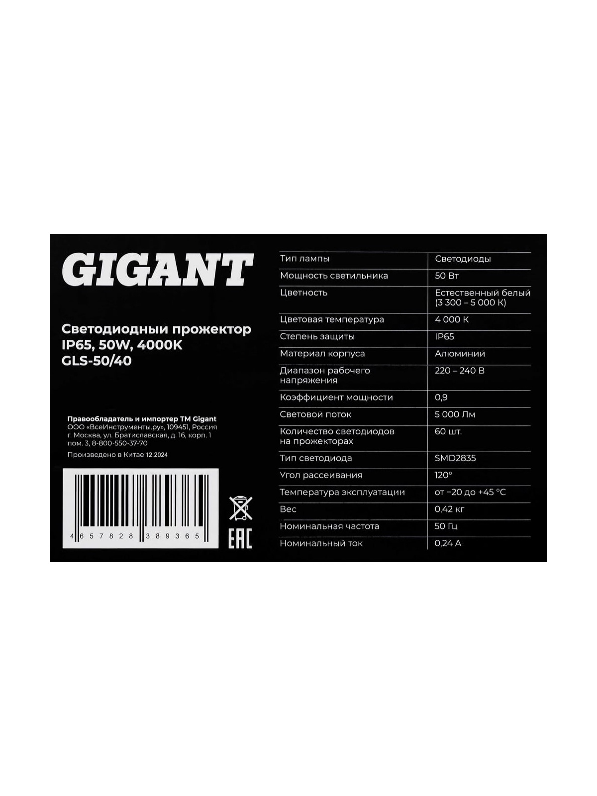 Светодиодный прожектор IP65 50W 4000K Gigant GLS-50/40 - высокопрочный, надежный, долговечный, пылевлагозащищенный осветительный прибор, который станет прекрасной альтернативой устаревшим моделям галогенных прожекторов. Изделие подходит для освещения различных уличных объектов и зимой, и летом. Тип и количество светодиодов: 60 светодиодов SMD2835. Угол рассеивания:120°. Температура эксплуатации: от -40 до +40°C. Степень защиты IP65 позволяет использовать прожектор как внутри, так и на улице. Корпус из литого под давлением алюминия с каленым стеклом. Цветовая температура - 4000К.