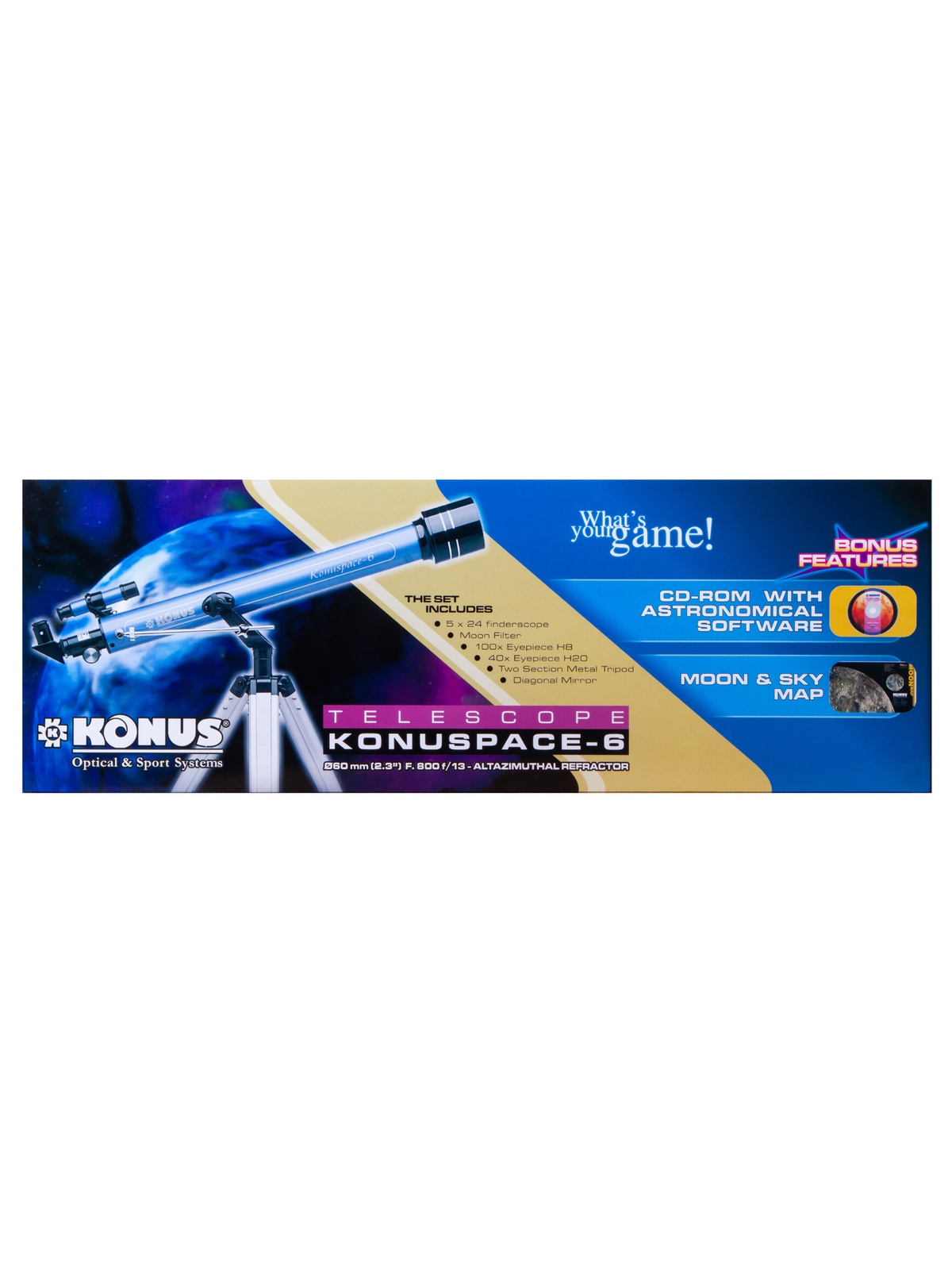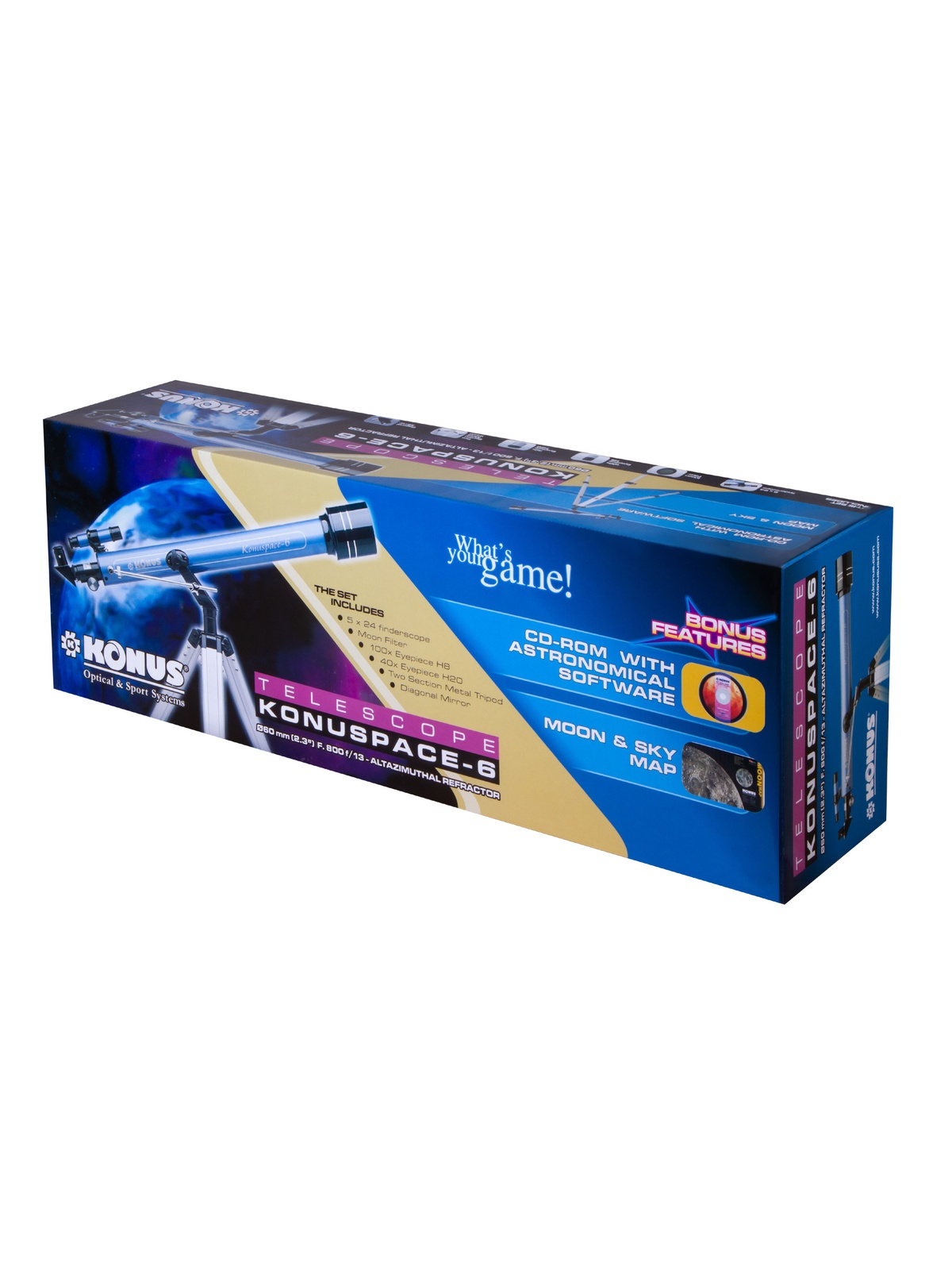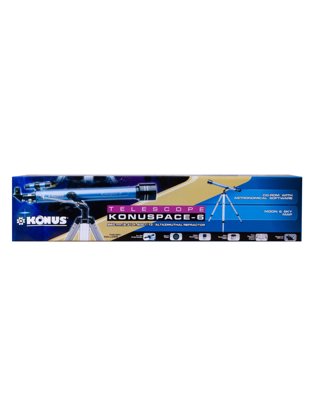 Телескоп Konus Konuspace-6 60/800 AZ создан для начальных астрономических наблюдений и станет прекрасным подарком ребенку или астроному-любителю, который еще только начинает свой путь в науку. Этот ахроматический рефрактор позволит получить общие представления об изучении космоса, детально рассмотреть Луну и увидеть отдельные планеты, но без деталей на них. Konus Konuspace-6 60/800 AZ также можно использовать и как зрительную трубу для наземных наблюдений.