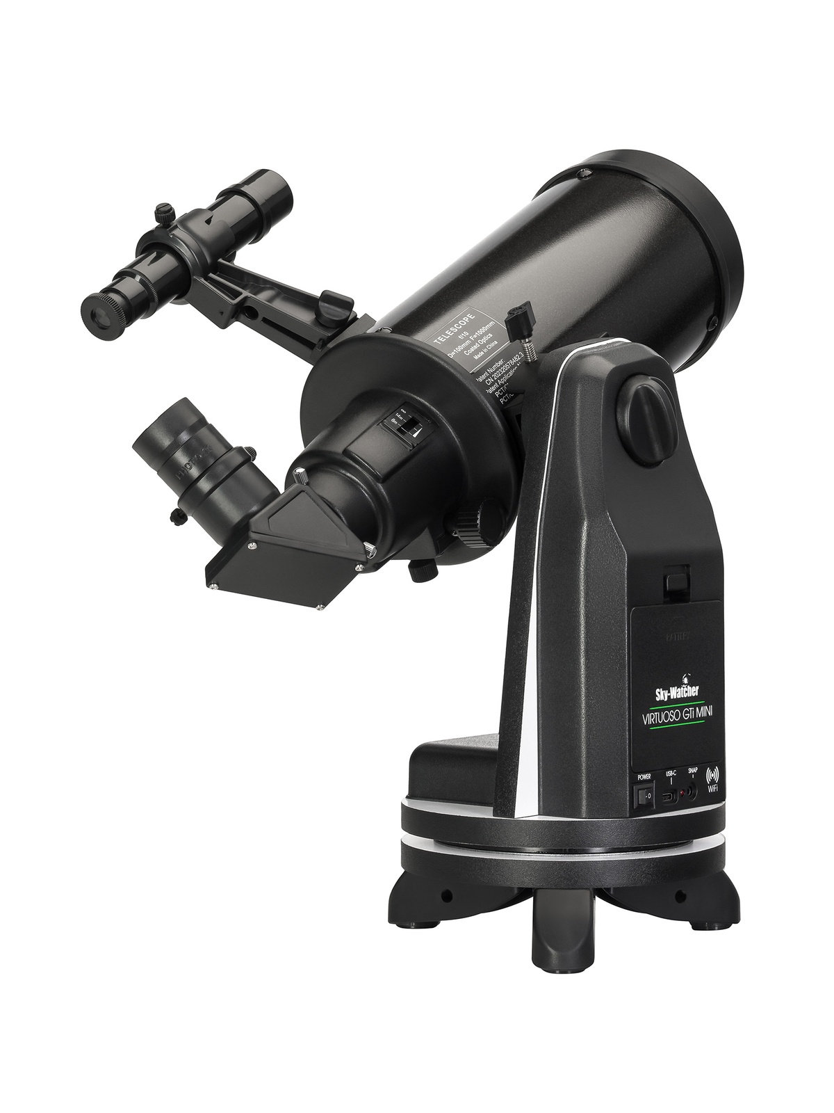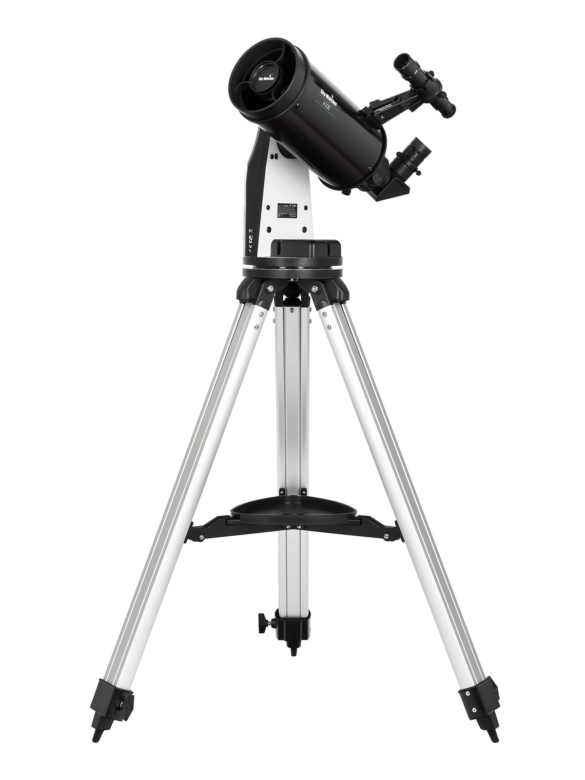 В комплект поставки Sky-Watcher K100 mini Virtuoso GTi включены начальные аксессуары для наблюдений: оптический искатель 5х24, окуляры PHOTO 10 мм и 20 мм, диагональное зеркало 90°, адаптер для смартфона, алюминиевая тренога с лотком для аксессуаров. Оптический искатель пригодится для ручного поиска и наведения на космические объекты, диагональное зеркало сделает работу с телескопом более удобной и физиологичной, а адаптер для смартфона можно использовать для фиксации видимого изображения на фото и видео. Прибор можно использовать с настольной подставкой или установить на треногу.