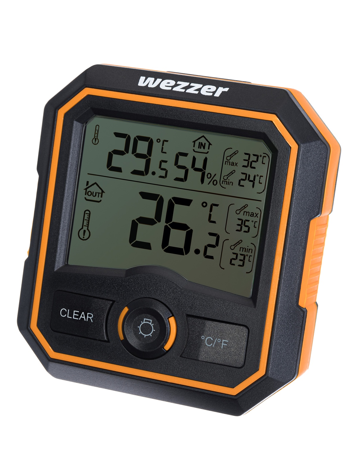 На экране прибора можно видеть текущие измерения температуры с основного модуля и термощупа, а также ее минимальные и максимальные значения. Также основной модуль измеряет влажность воздуха. У экрана есть подсветка, ее можно включить нажатием на кнопку на внешней панели.