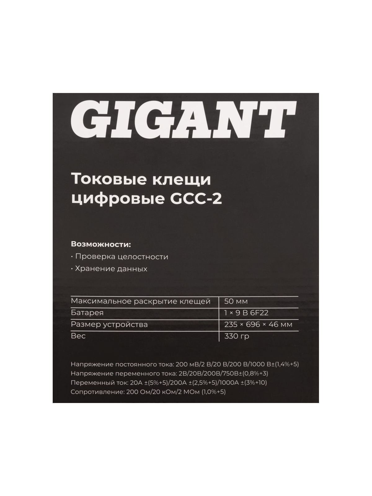 Токовые цифровые клещи Gigant GCC-2 измеряет переменный ток, напряжение, сопротивление и температуру. Встроенная откидная подставка в задней части корпуса обеспечивает удобную работу. Все необходимые данные выводятся на экран, что облегчает считывание информации. Функция DATA HOLD помогает зафиксировать данные на экране при работе в труднодоступных местах.