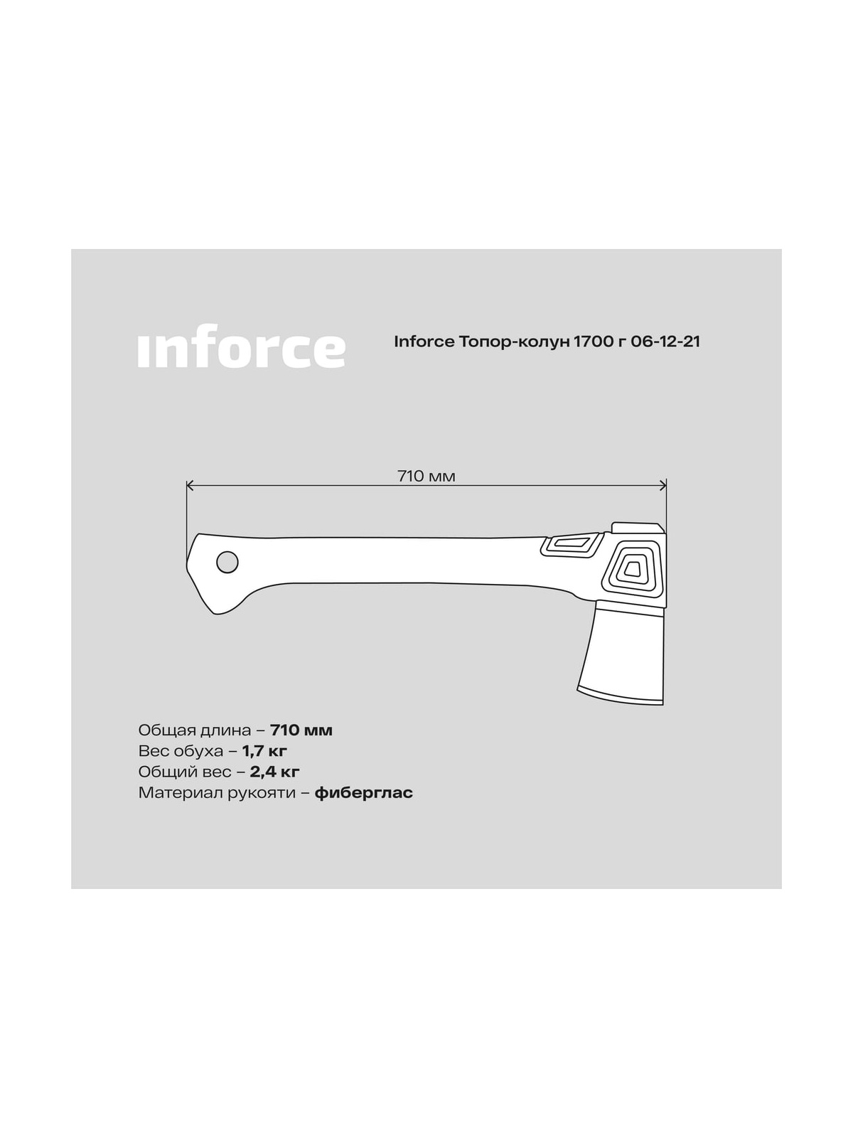 Топор-колун 1700 г Inforce 06-12-21 разработан для обтесывания и раскалывания древесины. Благодаря значительному весу обуха энергии достаточно для раскалывания бревна за один удар. Удобная рукоять не скользит в ладонях, что позволяет замахиваться для рубки с максимальной энергией. Надежное соединение обуха и рукояти обеспечивает длительный срок службы. Подходит для раскалывания бревен до 30 см в диаметре, подойдет для решения бытовых и профессиональных задач. Другие модели топоров.