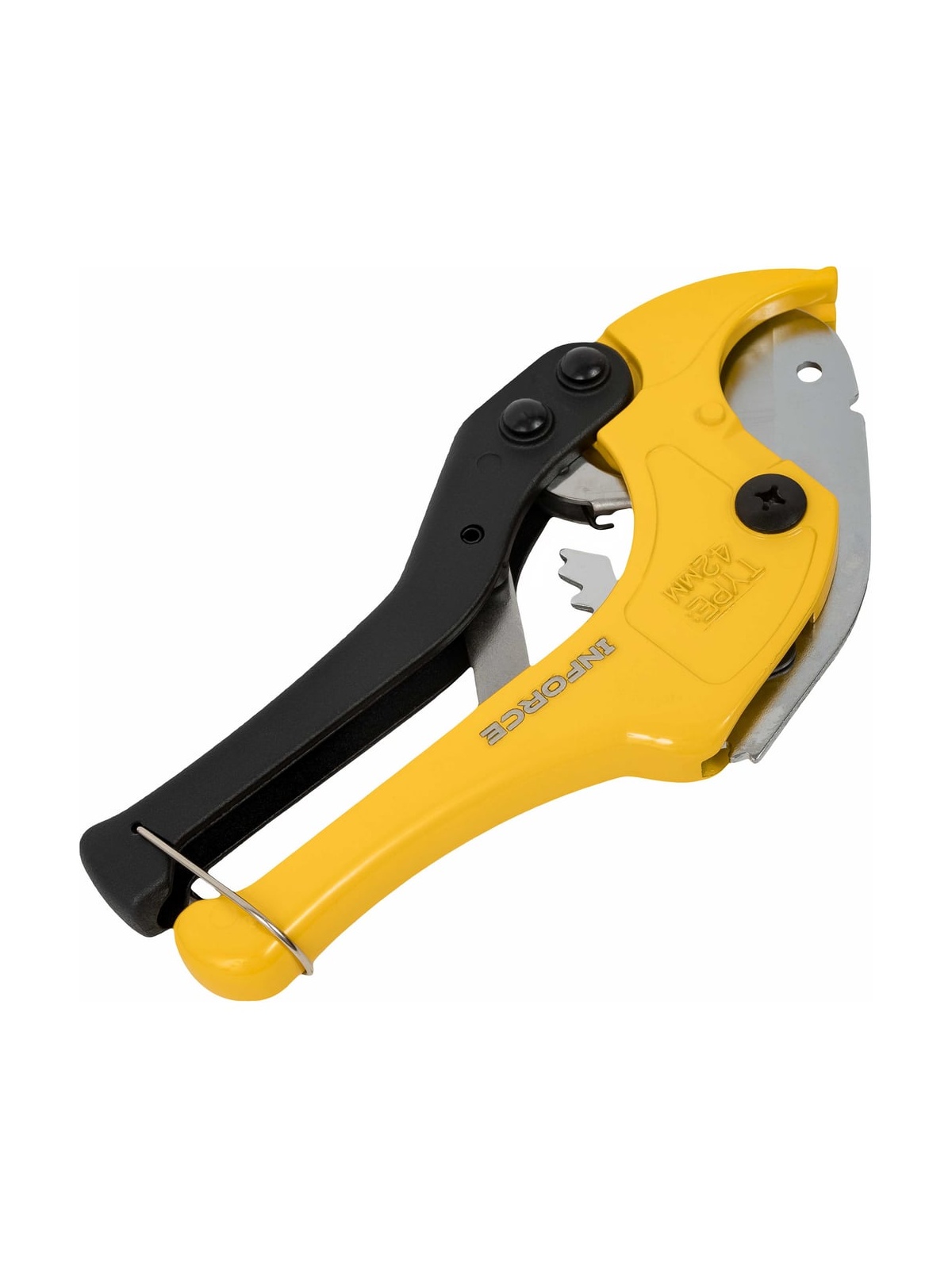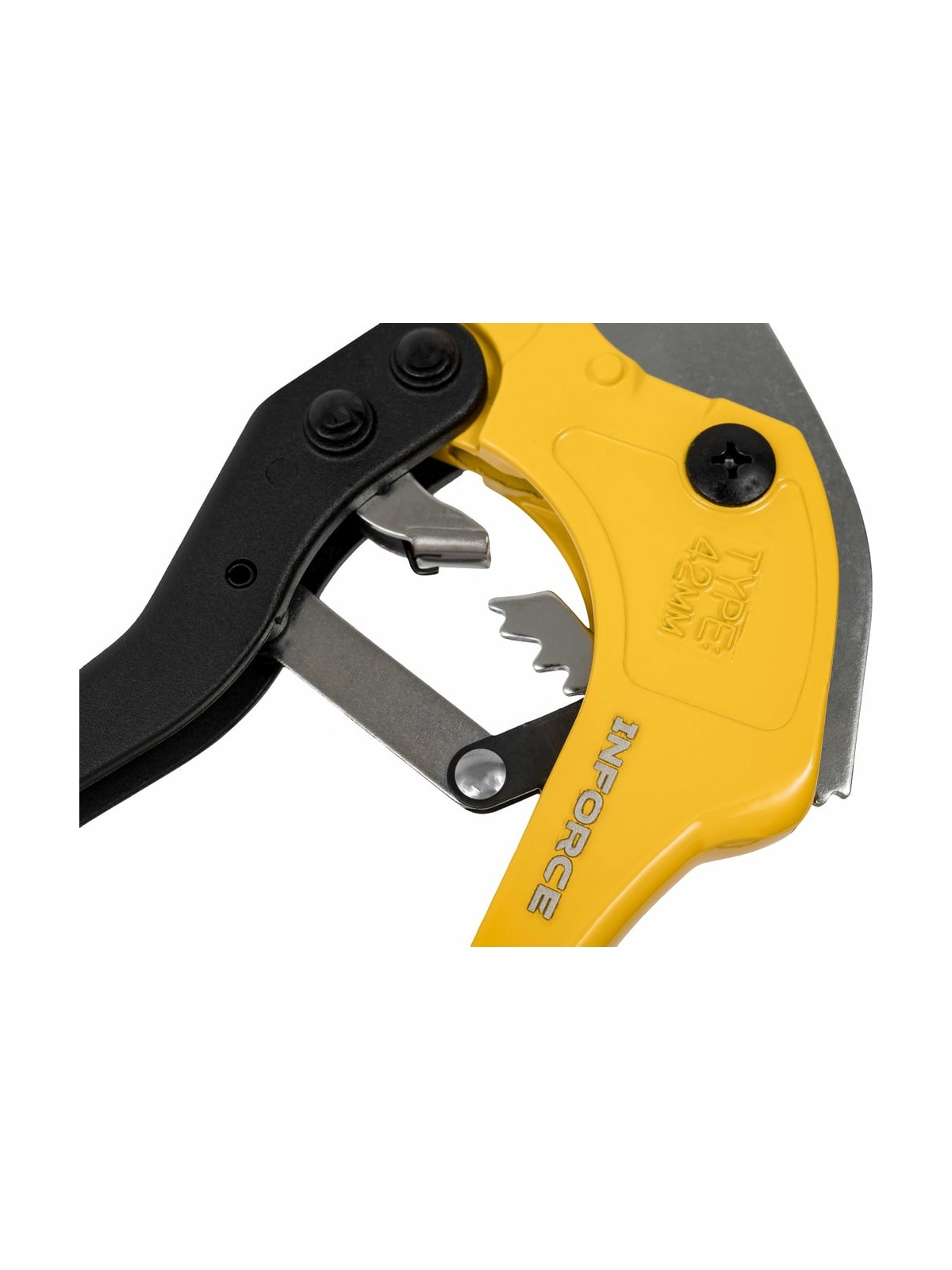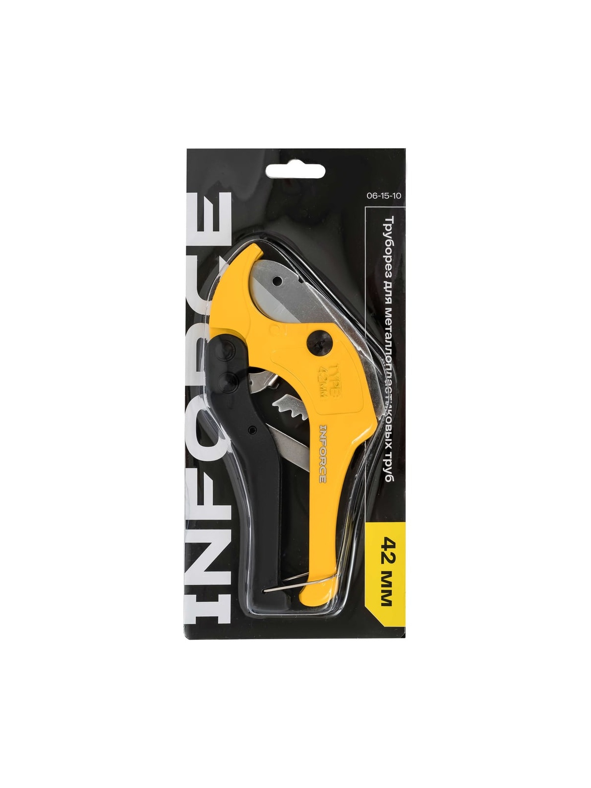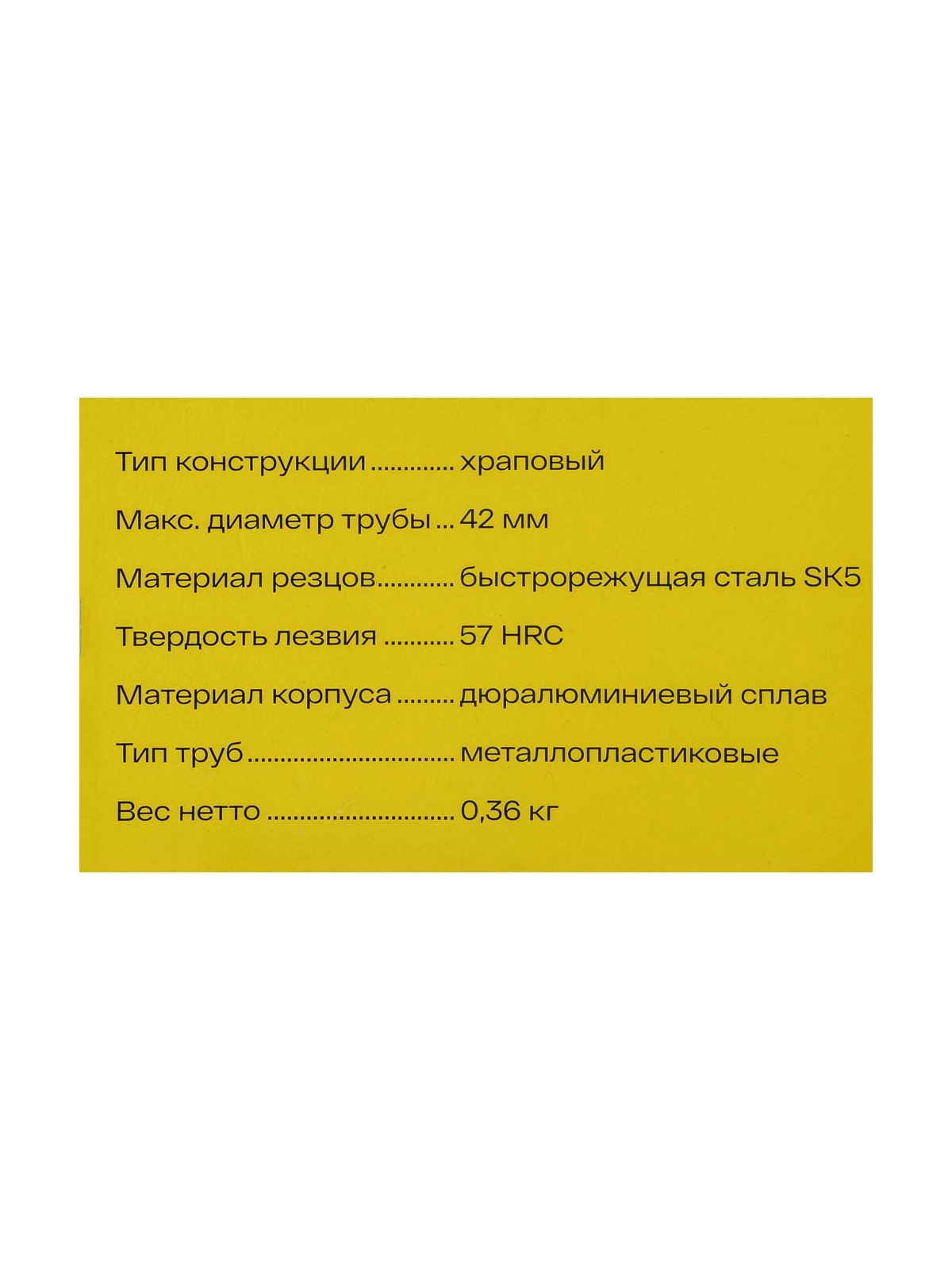 Труборез для металлопластиковых труб Inforce 42мм 06-15-10 представляет собой профессиональный инструмент, предназначенный для резки труб диаметром от 3 до 42 мм. Он оснащен храповым механизмом, который обеспечивает плавное и точное разрезание, минимизируя усилия пользователя. Резцы изготовлены из быстрорежущей стали, что гарантирует долговечность и высокую производительность при работе с металлопластиковыми трубами. Корпус выполнен из дюралюминиевого сплава, что делает инструмент легким и удобным в использовании, его вес составляет всего 0.360 кг.