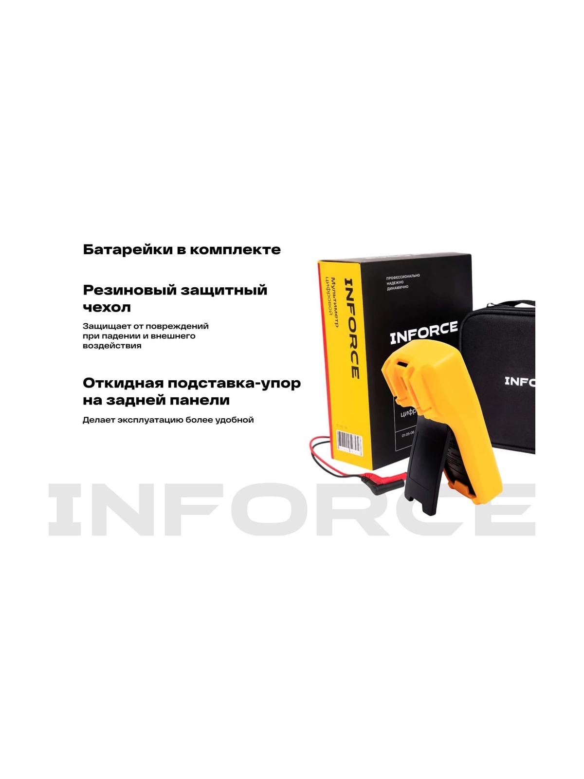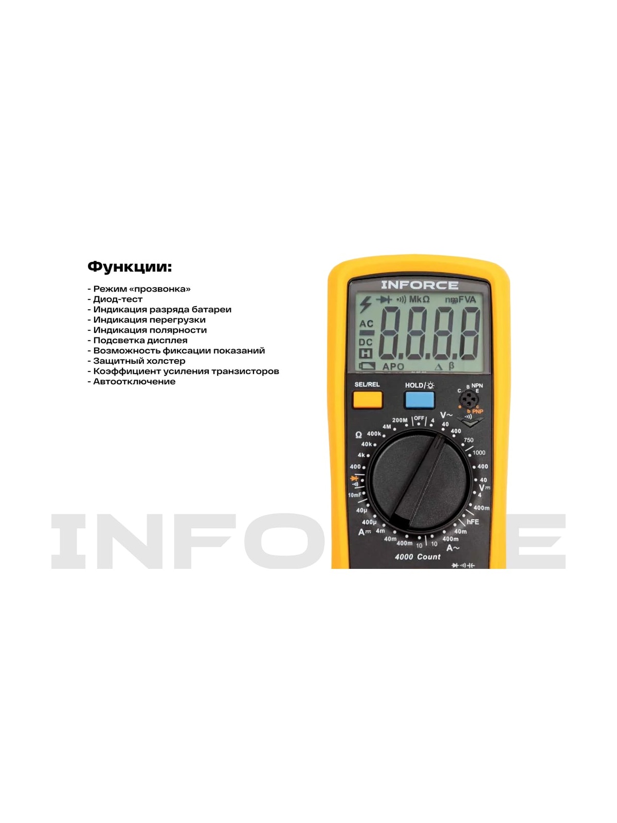 Цифровой мультиметр Inforce 01-05-06 используется для измерения постоянного и переменного тока, напряжения, сопротивления и емкости. Также прибор имеет режим прозвонки и теста диодов, что увеличивает возможности. Благодаря функции DATA HOLD можно зафиксировать только что измеренное значение на дисплее. Прибор оснащен защитой от перегрузки, что гарантирует надежность и безопасность в эксплуатации.