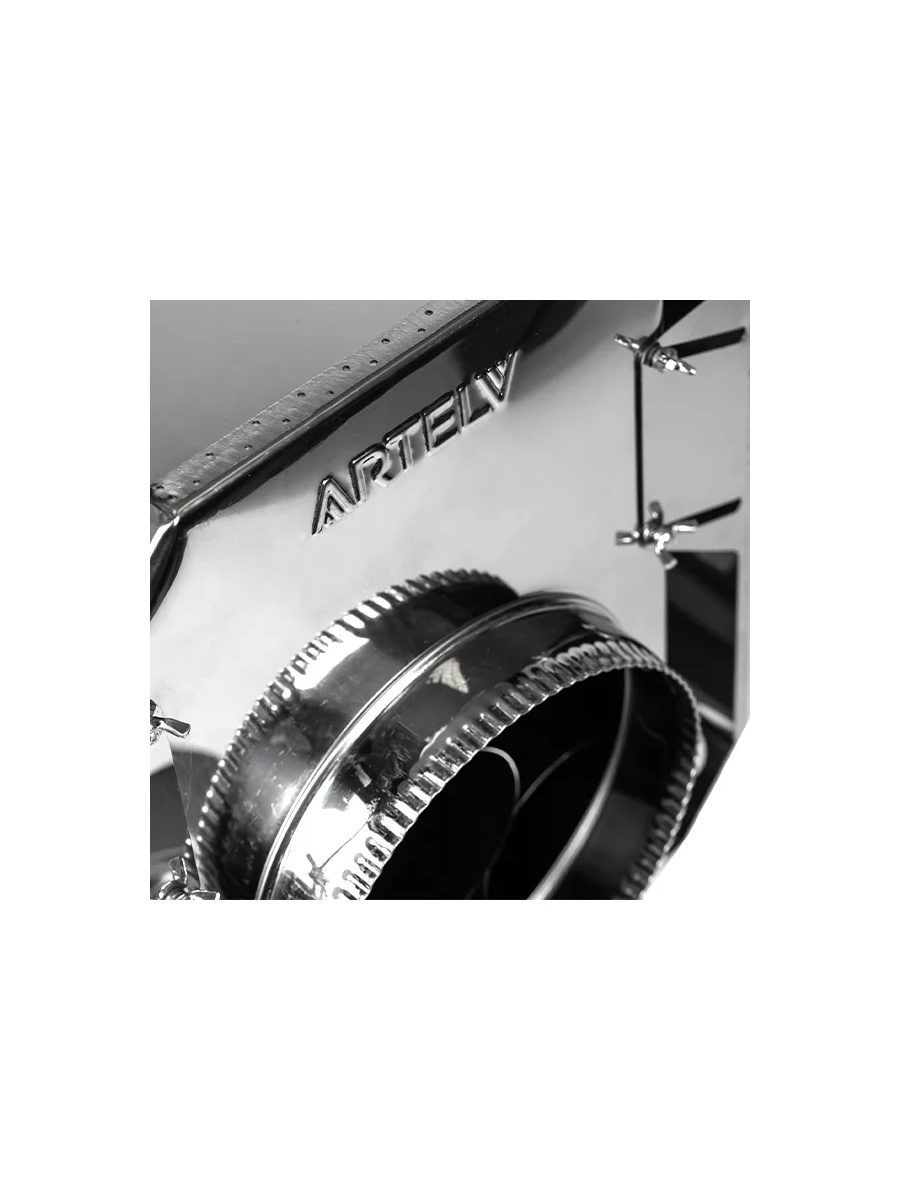 Расположенный на топочной дверце ARTELV ОЧАГ-30 перфорированный воздуховод ступенчато закрывается посредством регулировочного стакана. Плавное ограничение доступа воздуха открывает возможность создать оптимальную интенсивность сгорания дров, брикетов. В зависимости от типа и количества загруженного топлива, одной закладки топлива хватает на 6-8 часов бесперебойной топки печи.