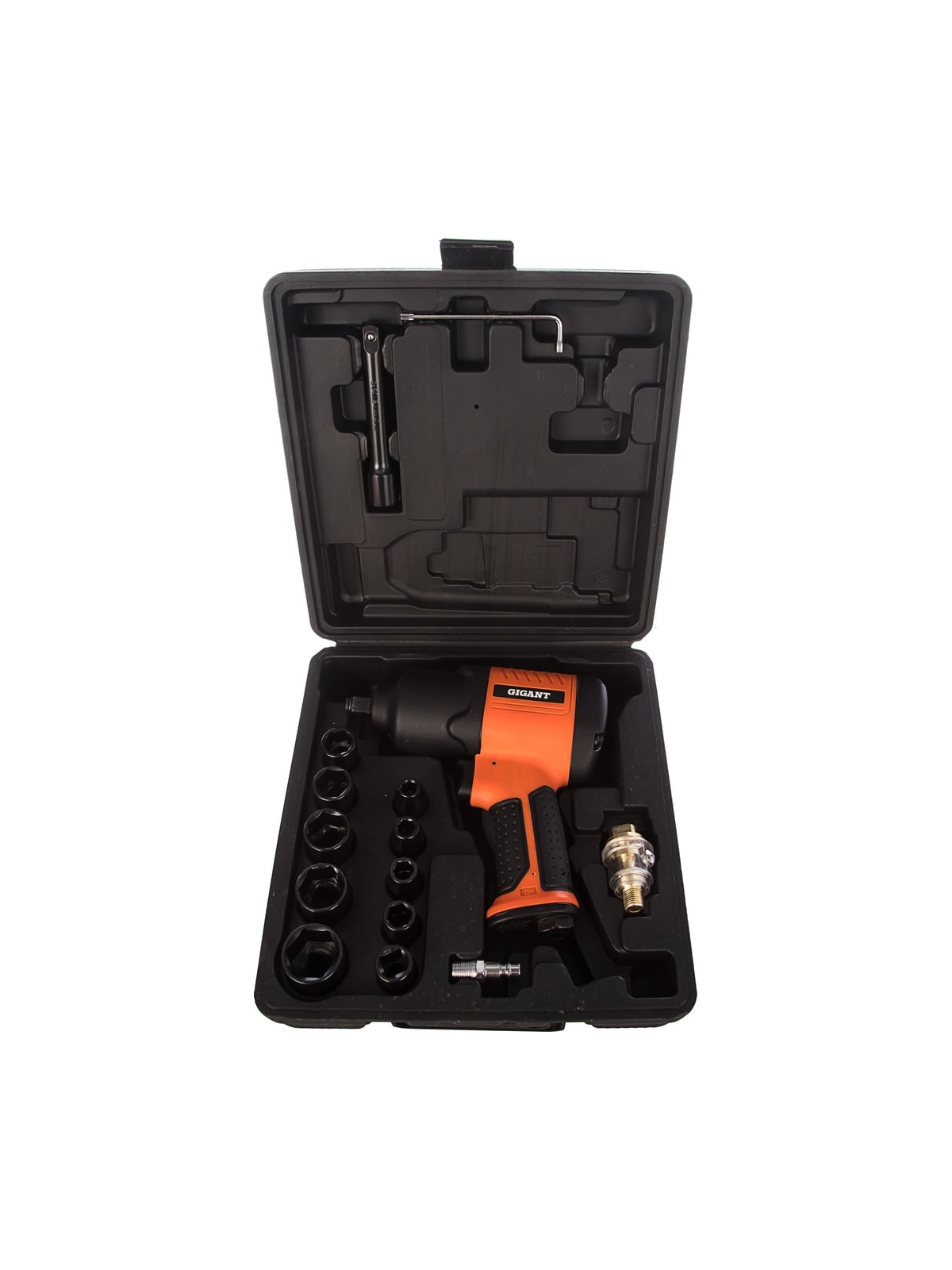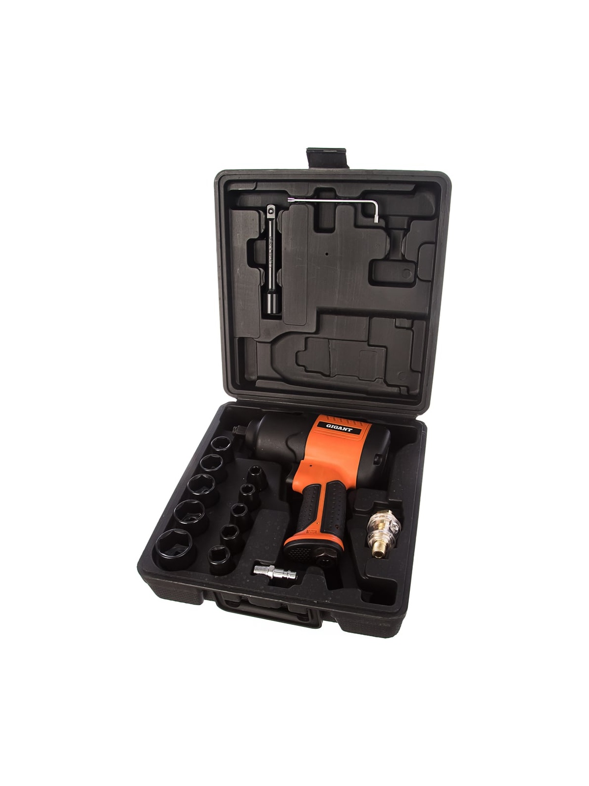 Ударный пневмогайковерт Gigant PW 720 + набор головок подходит для закручивания/откручивания гаек и болтов. Оснащен ударным механизмом Twin Hammer, который помогает справиться даже с приржавевшим крепежом. Точная регулировка. Степень затяжки болтов контролируется регулятором. Ударопрочность. Корпус инструмента отличается повышенной прочностью и устойчивостью к механическим повреждениям. Надежность. Прорезиненная рукоятка не скользит в руке, обеспечивая надежный хват.