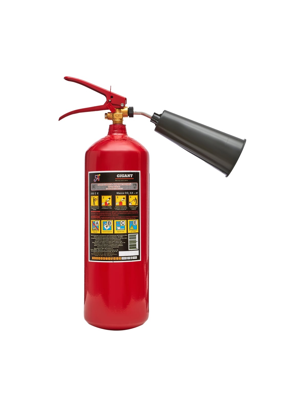 Углекислотный огнетушитель Gigant ОУ-2-ВСЕ-01 GT-ОУ-2 - это закачной огнетушитель высокого давления с зарядом жидкой двуокиси углерода, находящейся под давлением жидких паров. Применяется для первичного тушения пожаров и возгораний класса B, C, E (горючие и легковоспламеняющиеся жидкости, горючие газы, электроустановки, не превышающие напряжение 10000 Вольт). Основным преимуществом углекислотного огнетушителя является то, что двуокись углерода не повреждает объект тушения и не оставляет следов.