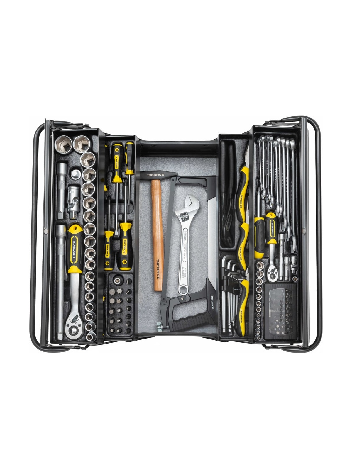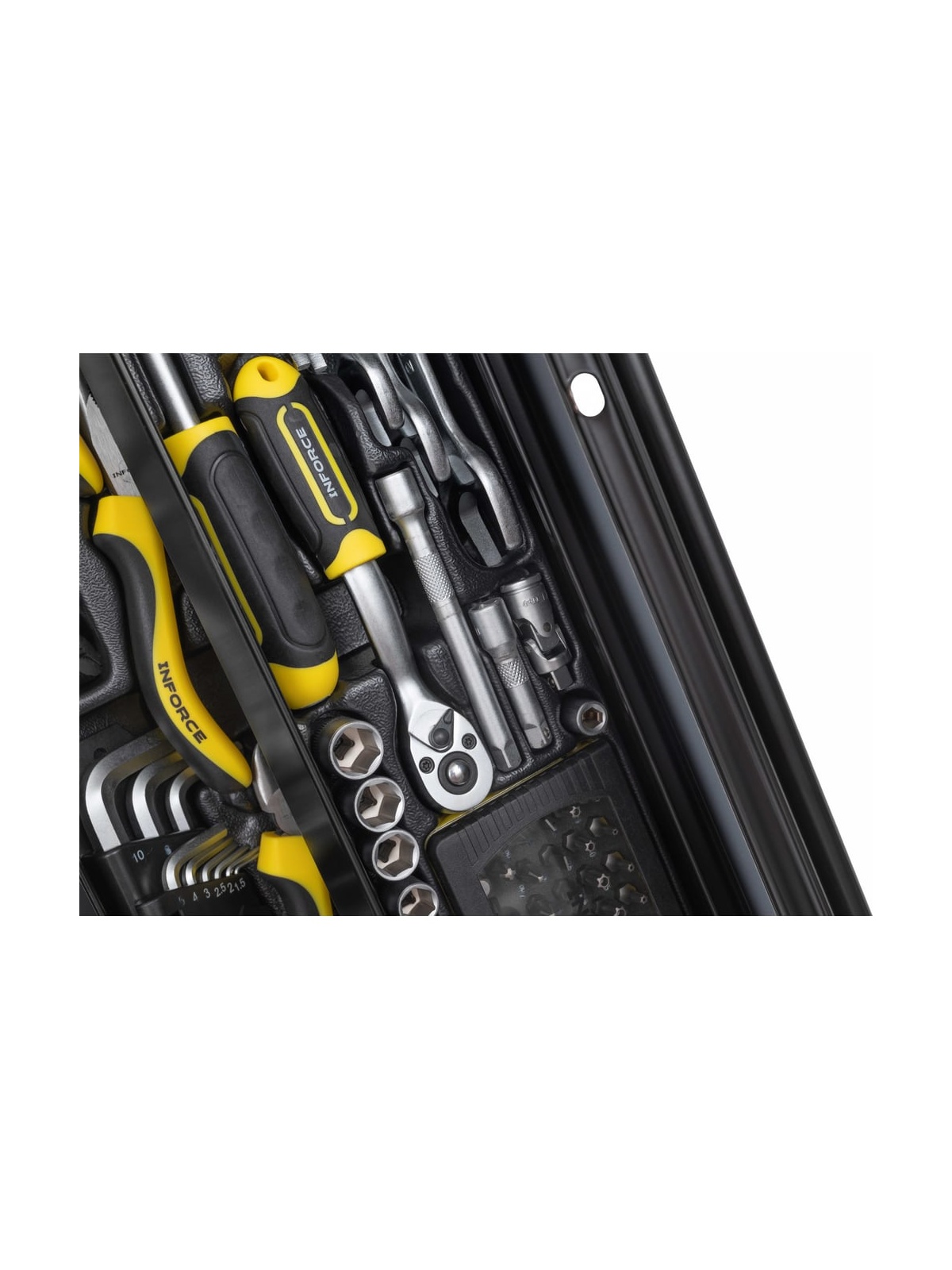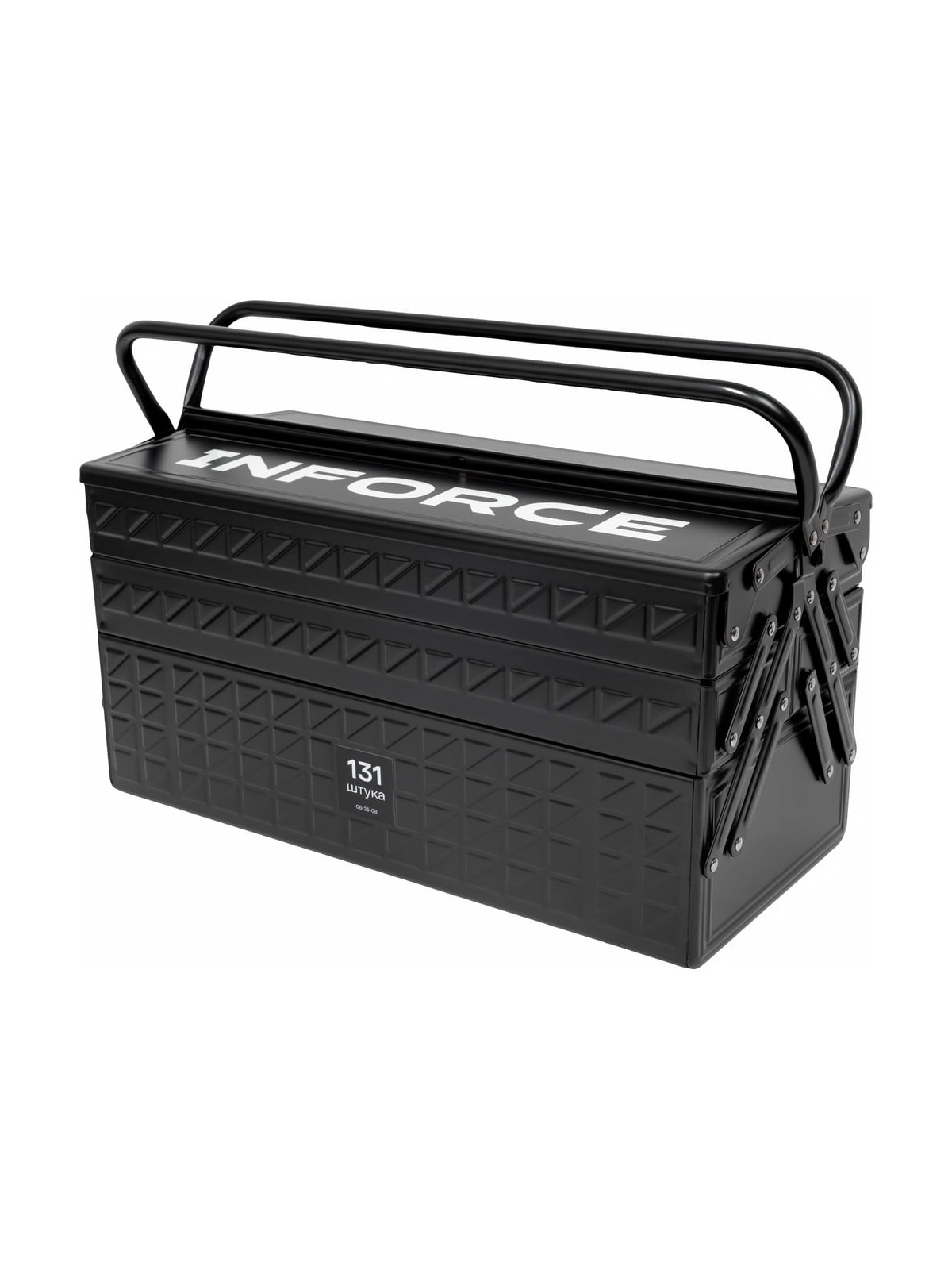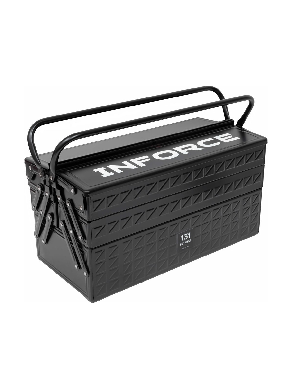 Универсальный набор инструмента Inforce 131 предмет 06-25-08 - это профессиональный комплект инструмента для проведения различных монтажных и слесарных работ. Он состоит из 131 инструмента. Набор снабжен профилем SUPER-LOCK для переноса пятен контактов с углов граней крепежа к их центру.