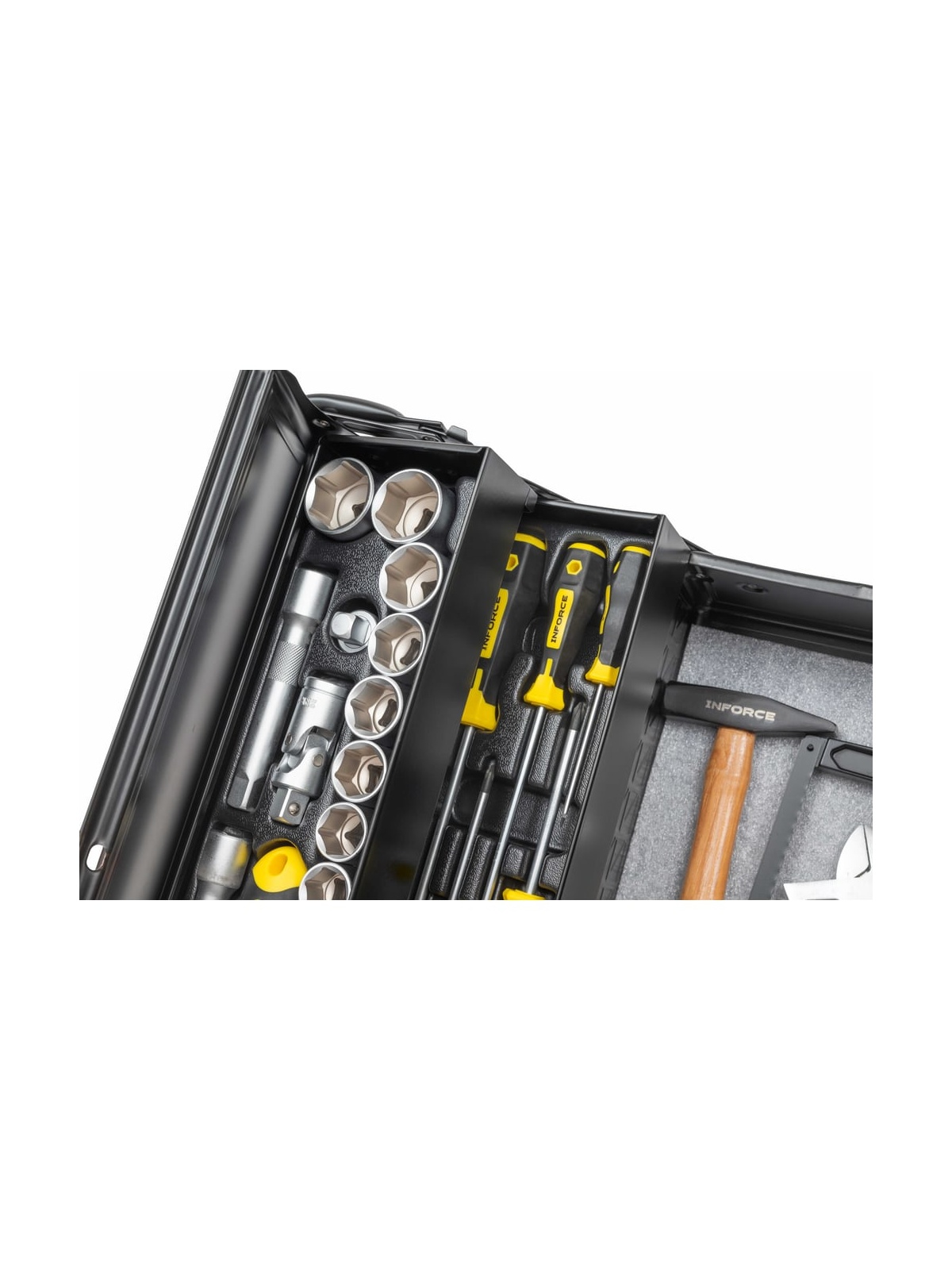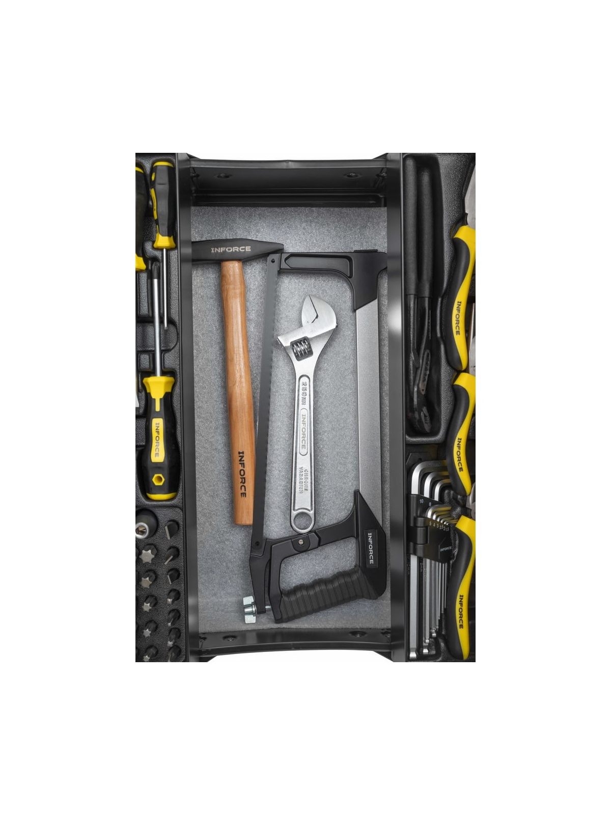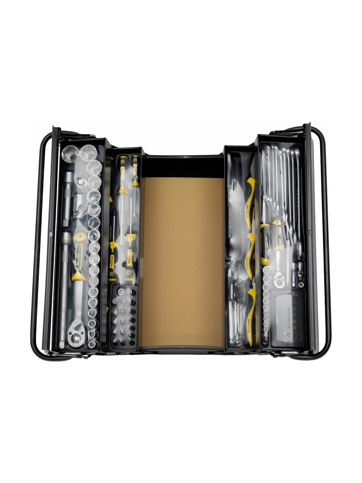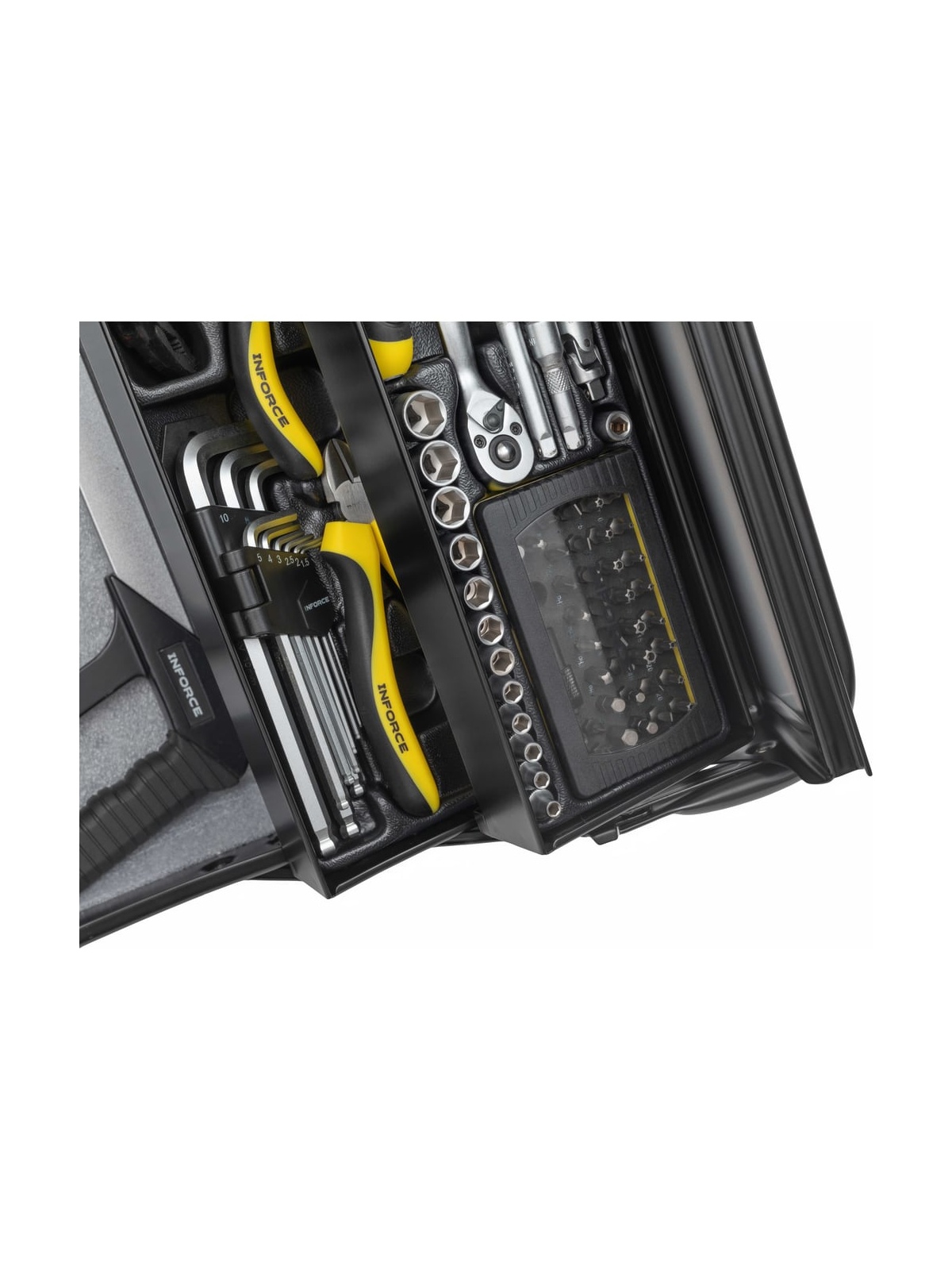 Универсальный набор инструмента Inforce 131 предмет 06-25-08 - это профессиональный комплект инструмента для проведения различных монтажных и слесарных работ. Он состоит из 131 инструмента. Набор снабжен профилем SUPER-LOCK для переноса пятен контактов с углов граней крепежа к их центру.