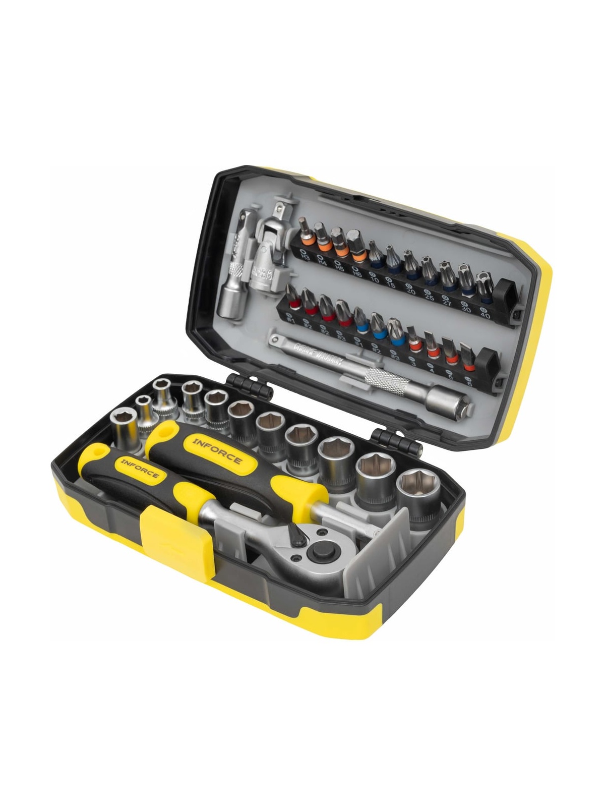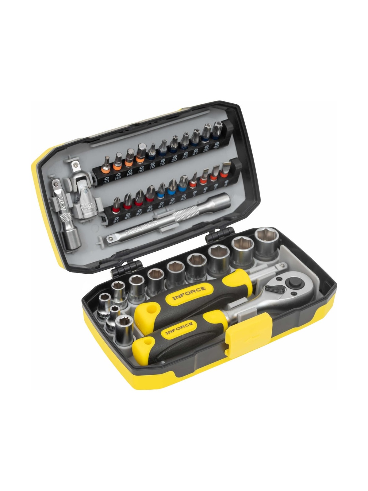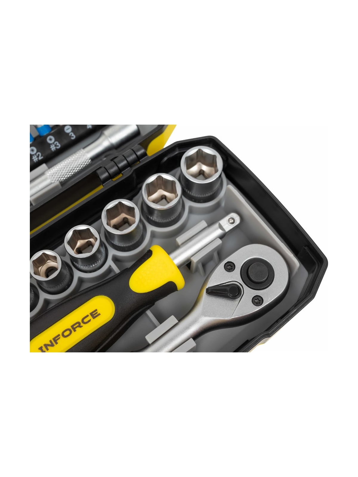 Универсальный набор инструмента Inforce 1/4" 38 предметов 06-25-09 подходит для профессиональных ремонтно-монтажных работ. В комплекте представлены разнообразные инструменты и приспособления для выполнения широкого спектра операций. Все компоненты выполнены из закаленной хромованадиевой стали высокого качества, выдерживают интенсивные нагрузки, имеют большой рабочий ресурс. Хромированные поверхности не подвержены появлению коррозии. Для удобства транспортировки и хранения комплекта предусмотрен закрывающийся футляр.
