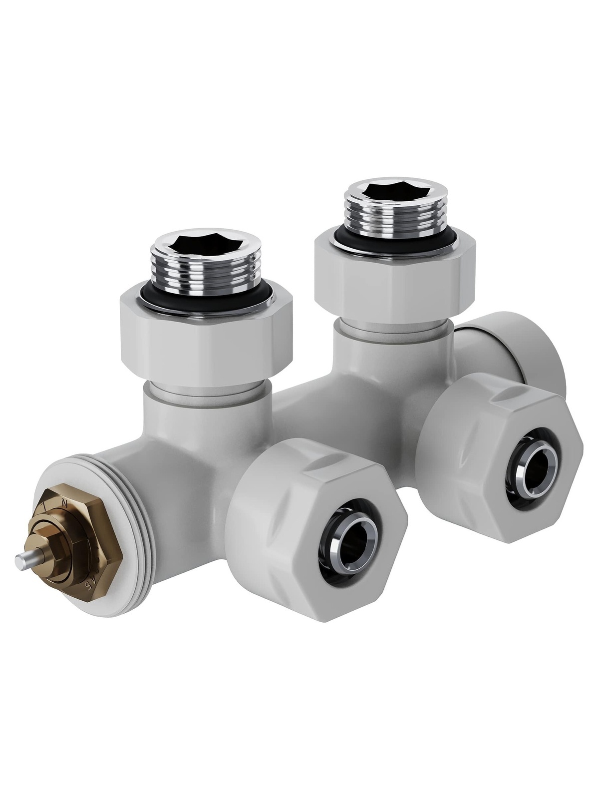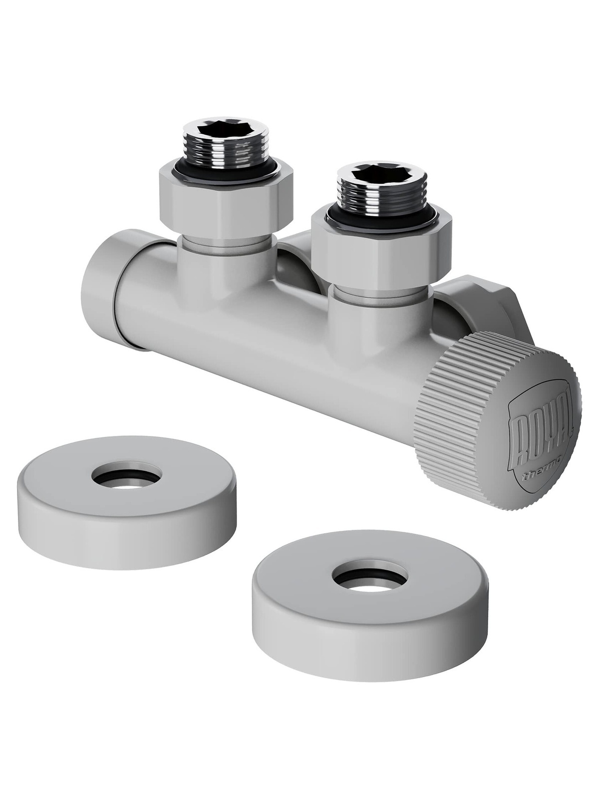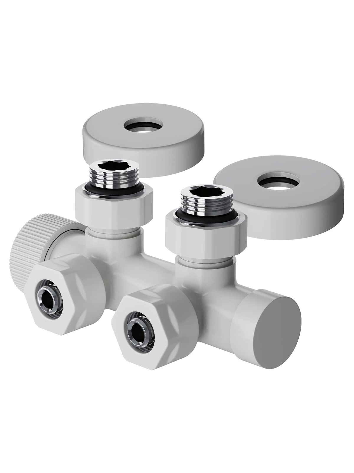 Узел нижнего подключения термостатический угловой серии Design Pro поставляется в необходимой для чистового монтажа комплектации: клапан термостатический для установки на подающий трубопровод, запорный клапан для установки на обратный трубопровод, 2 гайки-фитинга для подключения клапанов к монтажной трубке 15 мм и 2 цельных латунных отражателя с внутренним резиновым уплотнением внутренним диаметром 15,2 мм.