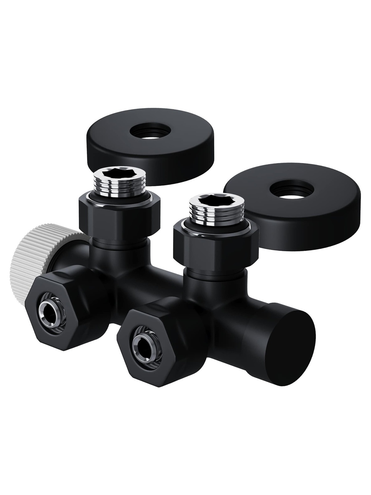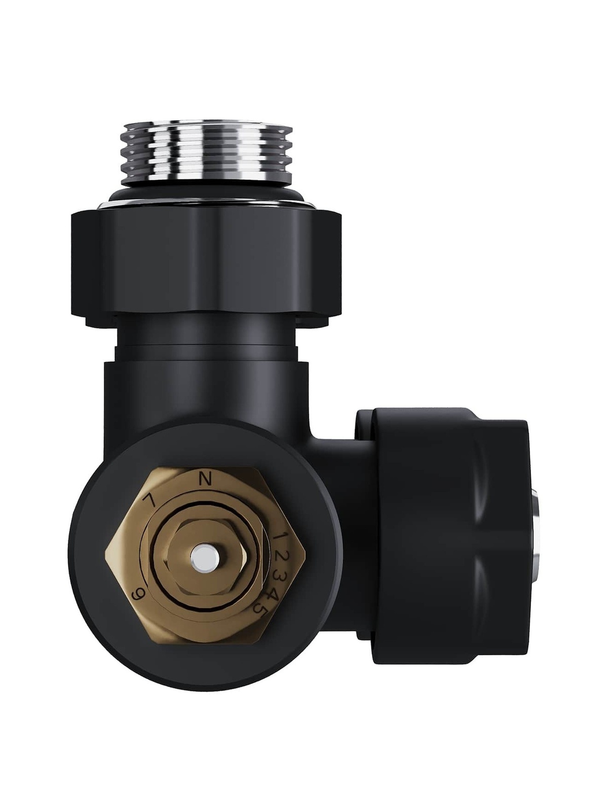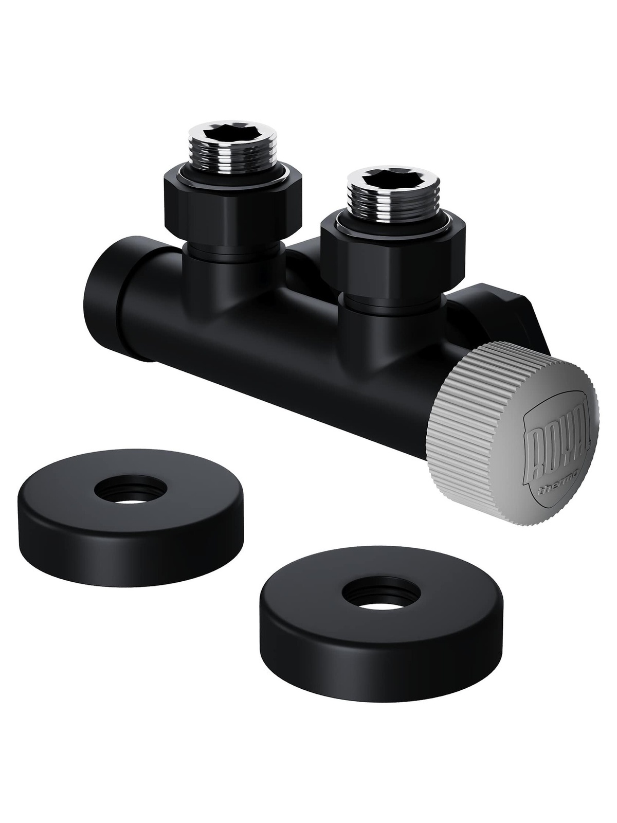Узел нижнего подключения термостатический угловой серии Design Pro поставляется в необходимой для чистового монтажа комплектации: клапан термостатический для установки на подающий трубопровод, запорный клапан для установки на обратный трубопровод, 2 гайки-фитинга для подключения клапанов к монтажной трубке 15 мм и 2 цельных латунных отражателя с внутренним резиновым уплотнением внутренним диаметром 15,2 мм.