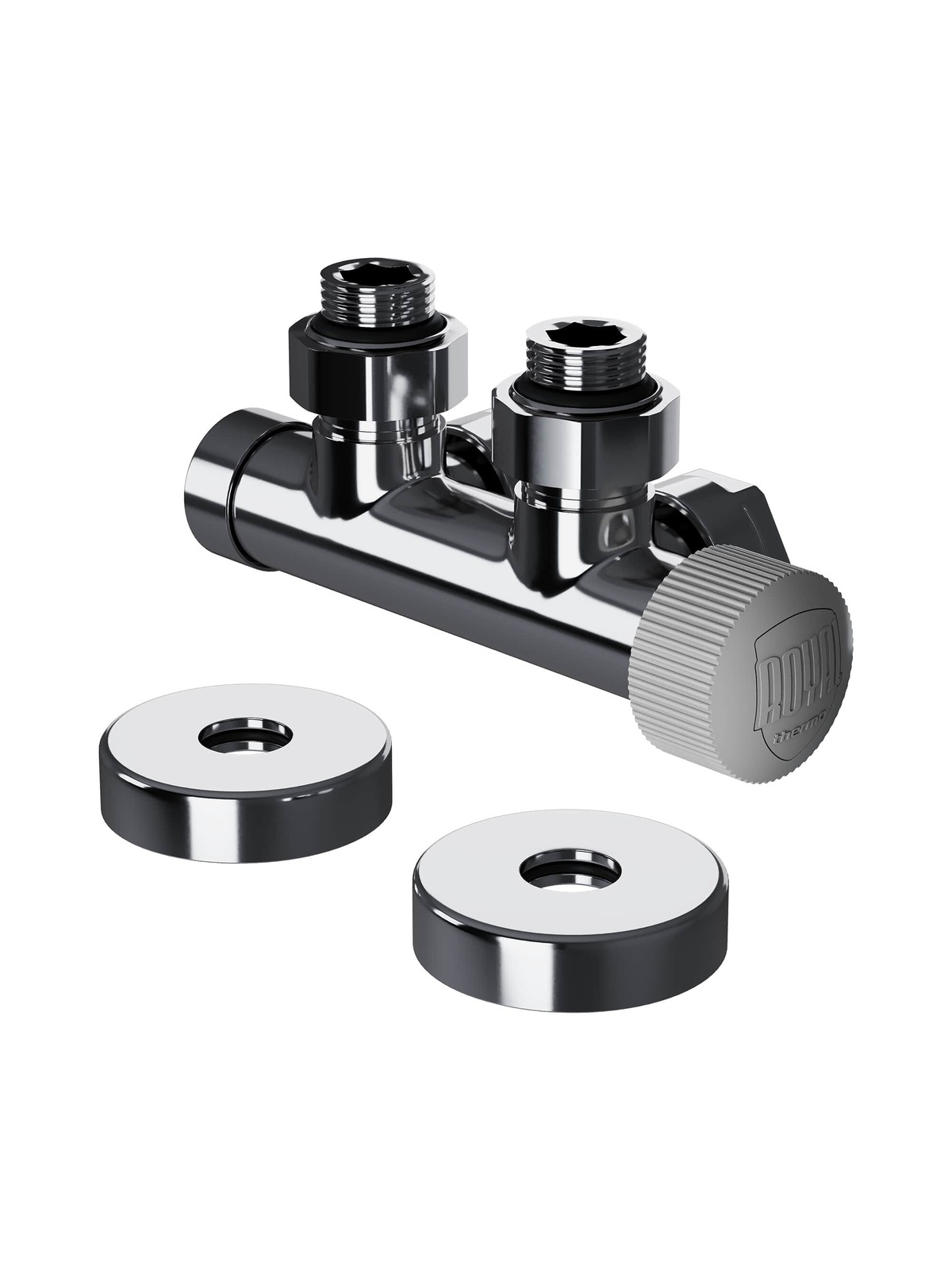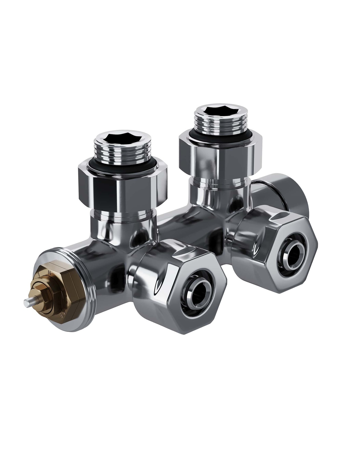 Узел нижнего подключения термостатический угловой серии Design Pro поставляется в необходимой для чистового монтажа комплектации: клапан термостатический для установки на подающий трубопровод, запорный клапан для установки на обратный трубопровод, 2 гайки-фитинга для подключения клапанов к монтажной трубке 15 мм и 2 цельных латунных отражателя с внутренним резиновым уплотнением внутренним диаметром 15,2 мм.
