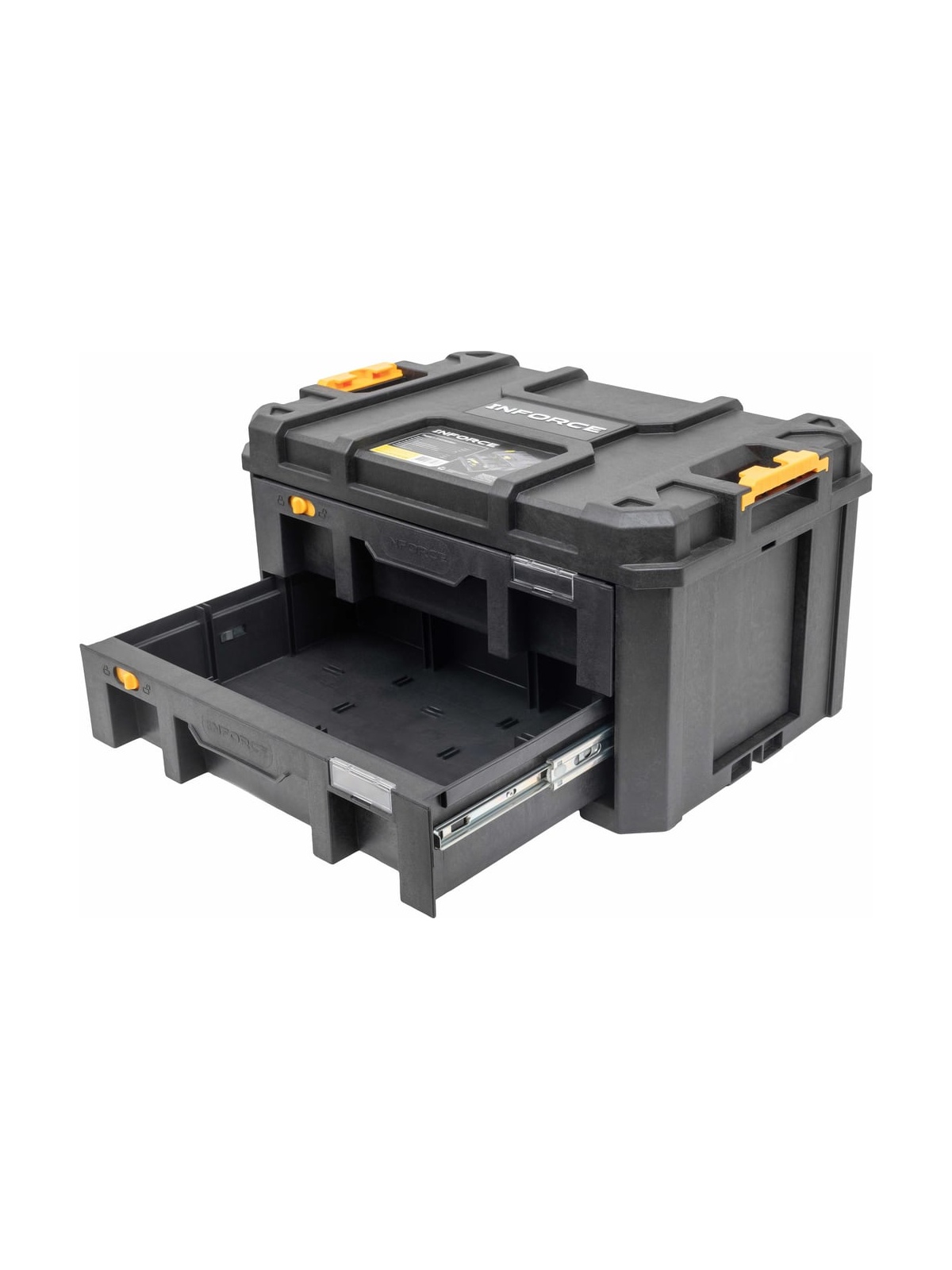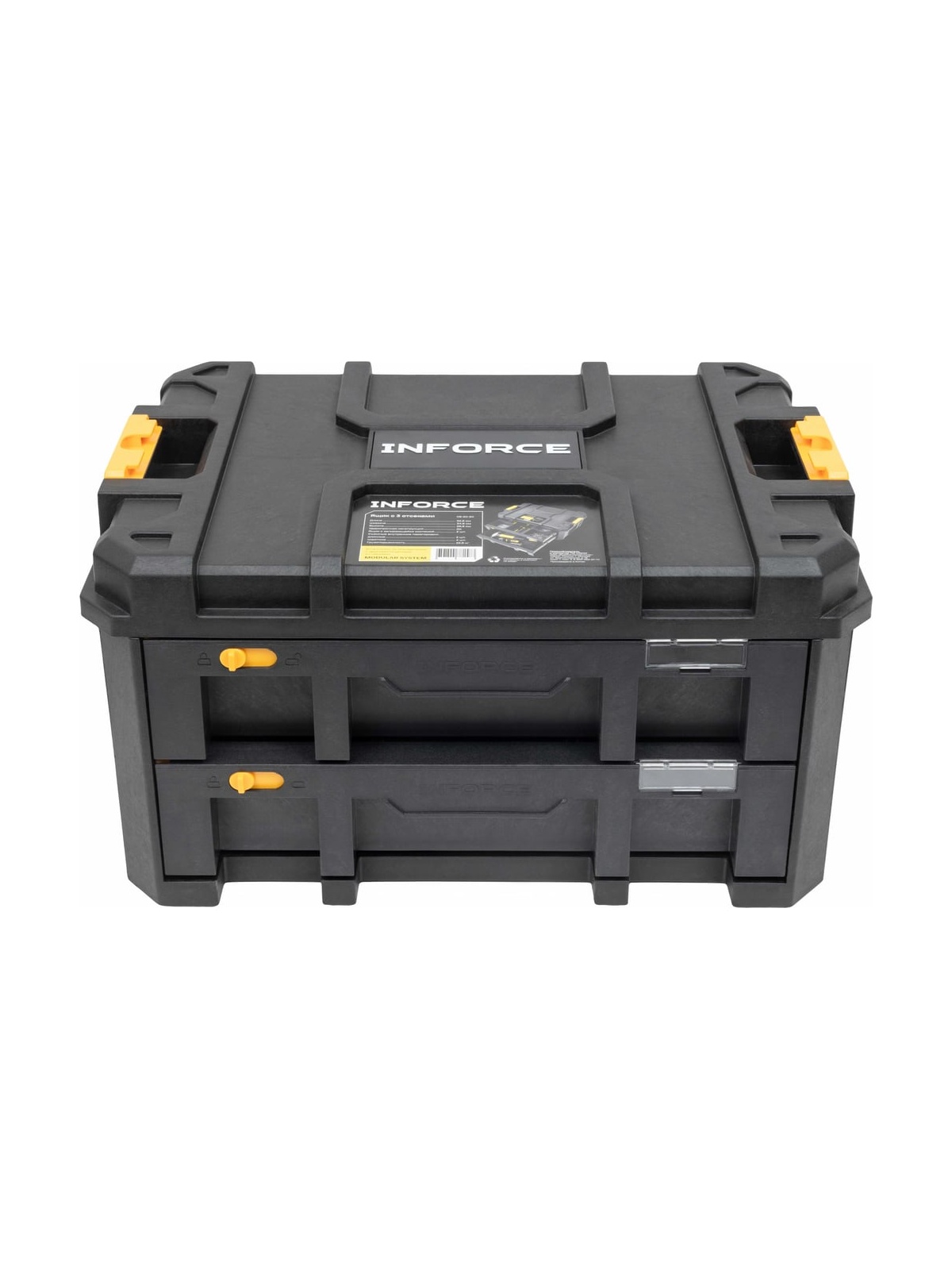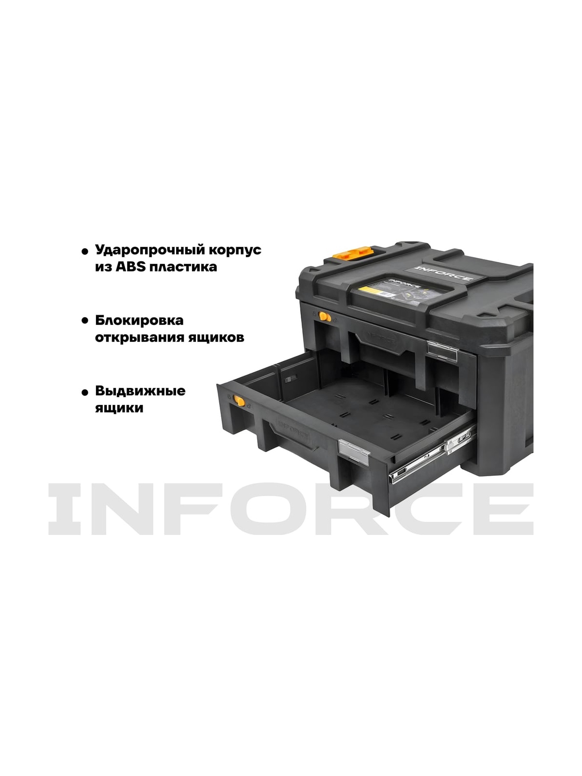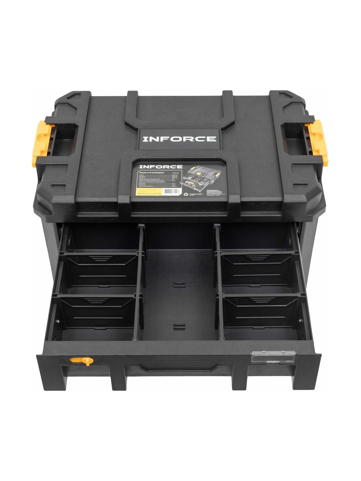 Ящик Inforce с 2 отсеками 06-20-20 обеспечивает удобное хранение и транспортировку инструментов и аксессуаров. Ящик входит в линейку системы хранения Inforce MODULAR SYSTEM. 2 выдвижные секции с переставными перегородками для организации пространства 4 длинных и 4 коротких перегородки внутри позволяют разместить мелкий инструмент и расходные материалы в одном месте Размеры выдвижных секций: 30х3,5 см Возможность блокировки выдвижных секций с помощью замка Новые защелки для скрепления модулей с интуитивно понятным принципом работы для экономии времени Новые более широкие и прочные рукоятки для переноски с улучшенной эргономикой в месте хвата Материал ящика - стойкий к падениям и ударам полипропилен