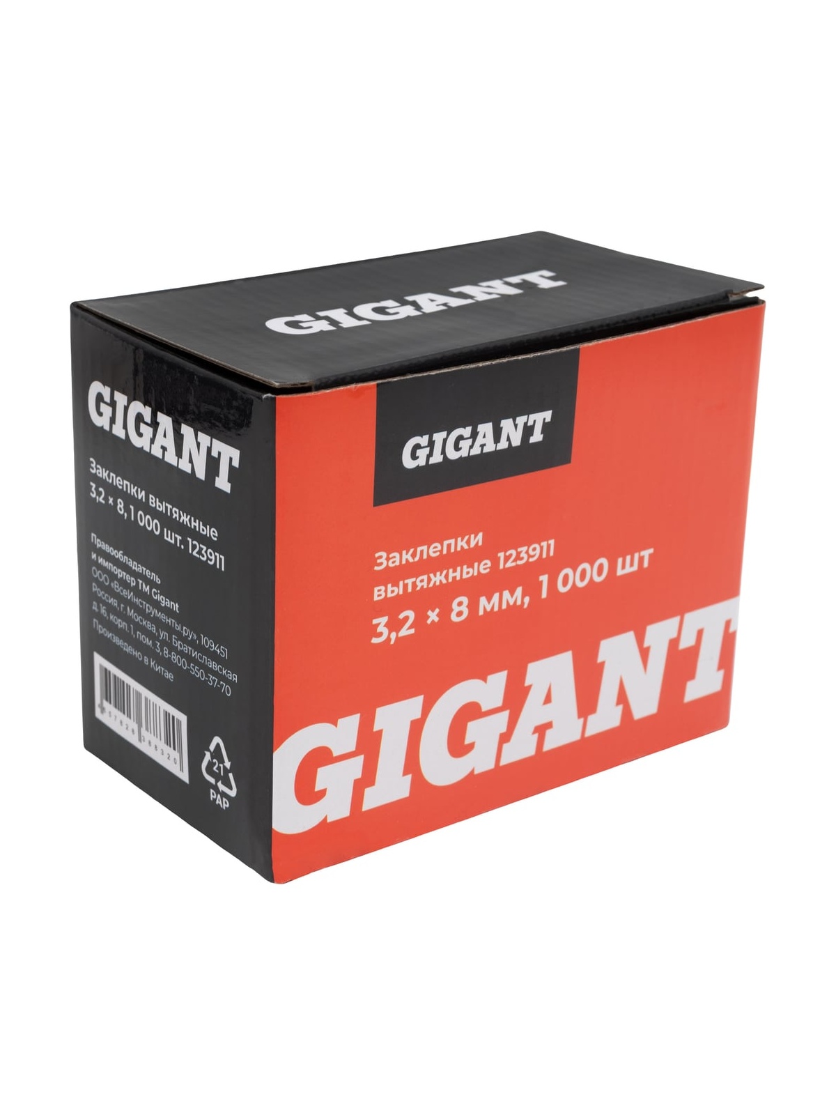 Заклепки вытяжные Gigant 123911 размером 3,2x8 мм представляют собой надежное решение для соединения различных материалов. В упаковке содержится 1000 штук, что обеспечивает длительное использование без необходимости частого пополнения запасов. Гильза заклепок изготовлена из алюминия, что гарантирует легкость и устойчивость к коррозии. Диаметр заклепок составляет 3,2 мм, а длина гильзы - 8 мм, что делает их подходящими для соединения материалов с толщиной от 3,5 до 5,5 мм.