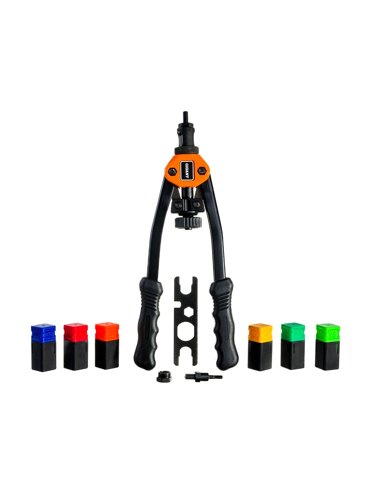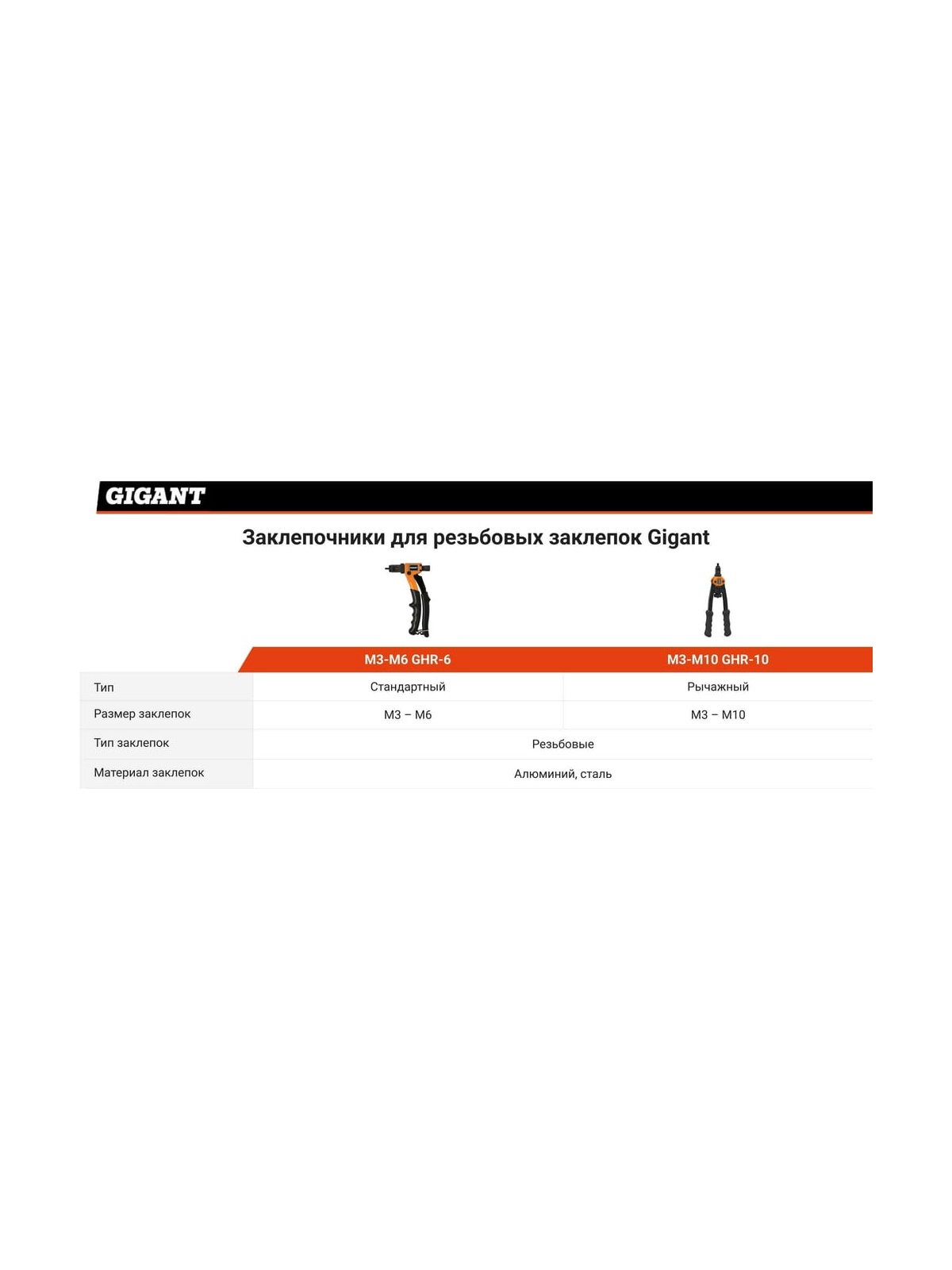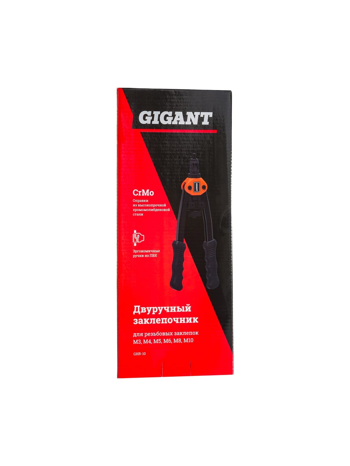 Заклепочник для резьбовых заклепок Gigant двуручный M3-M10 GHR-10 служит для быстрого и удобного скрепления между собой различных материалов при помощи заклепок с резьбой. Простое управление - рычажная система увеличивает усилие, достаточное для вращения заклепки в металлическом профиле. Заклепочник изготовлен из качественных материалов, поэтому отличается высокой прочностью и устойчивостью к износу. Рукоятки не скользят в ладонях и имеют специальный профиль для надежного хвата. Инструмент подходит для стальных и алюминиевых заклепок. В комплект входят сменные насадки самых распространенных размеров резьбы. Также в комплекте есть ключ для удобного и быстрого обслуживания изделия. Продукция представлена профессиональными и бытовыми инструментами, имеет доступную цену и высокое качество. При изготовлении товаров Gigant используется современное оборудование и прочные материалы. Производство осуществляется на современных предприятиях России и Азии. Тестирование товаров осуществляется в два этапа, каждая партия инструментов проходит проверку на соответствие стандартам и заявленным техническим характеристикам. Это является залогом качества и надежности готового продукта. Продукция представлена широкой линейкой инструментов. У нас можно приобрести ручной инструмент, строительный, садовый, сантехнический, климатический, крепежный, автогаражный, а также станки, расходные материалы и многое другое.