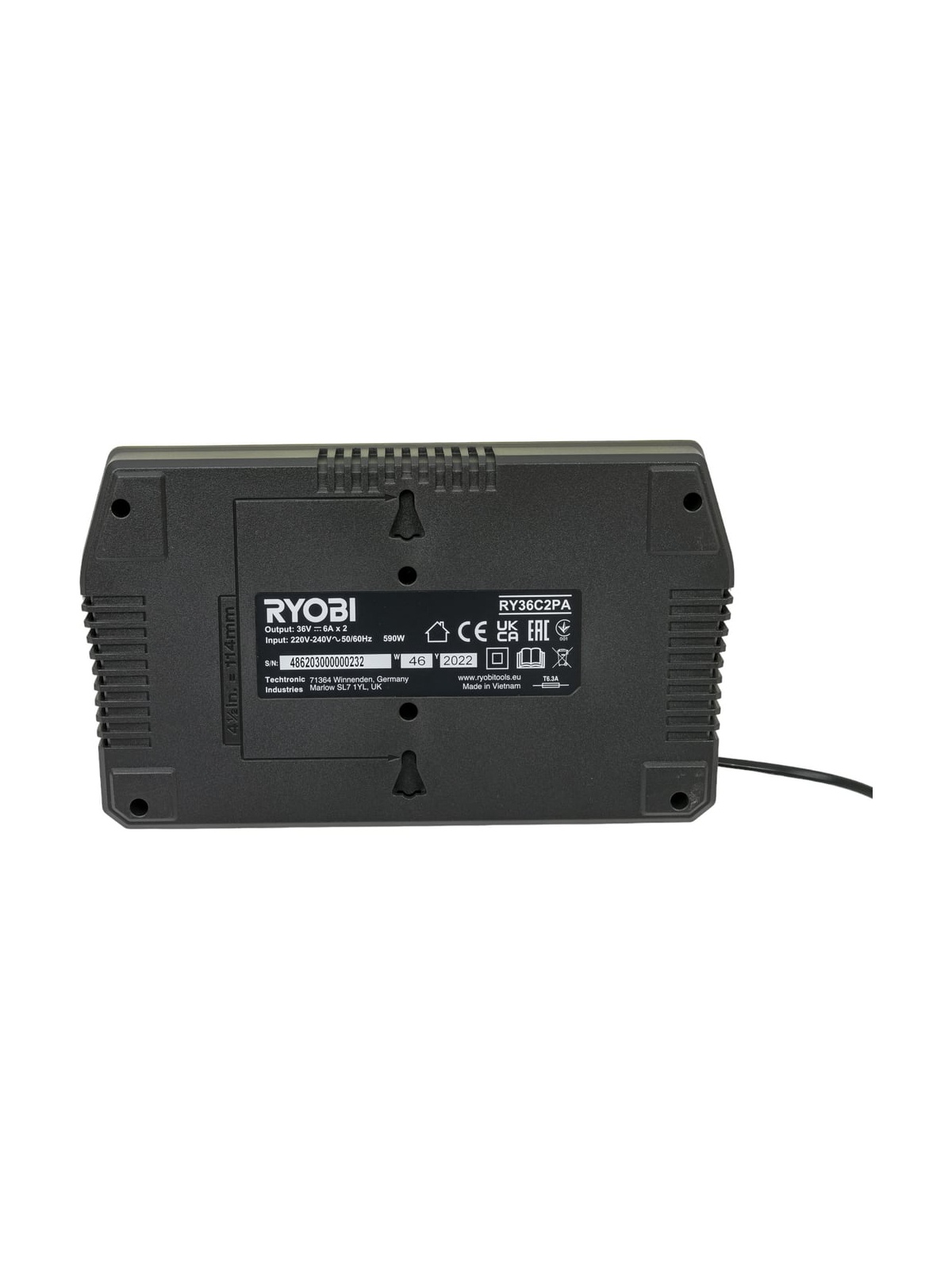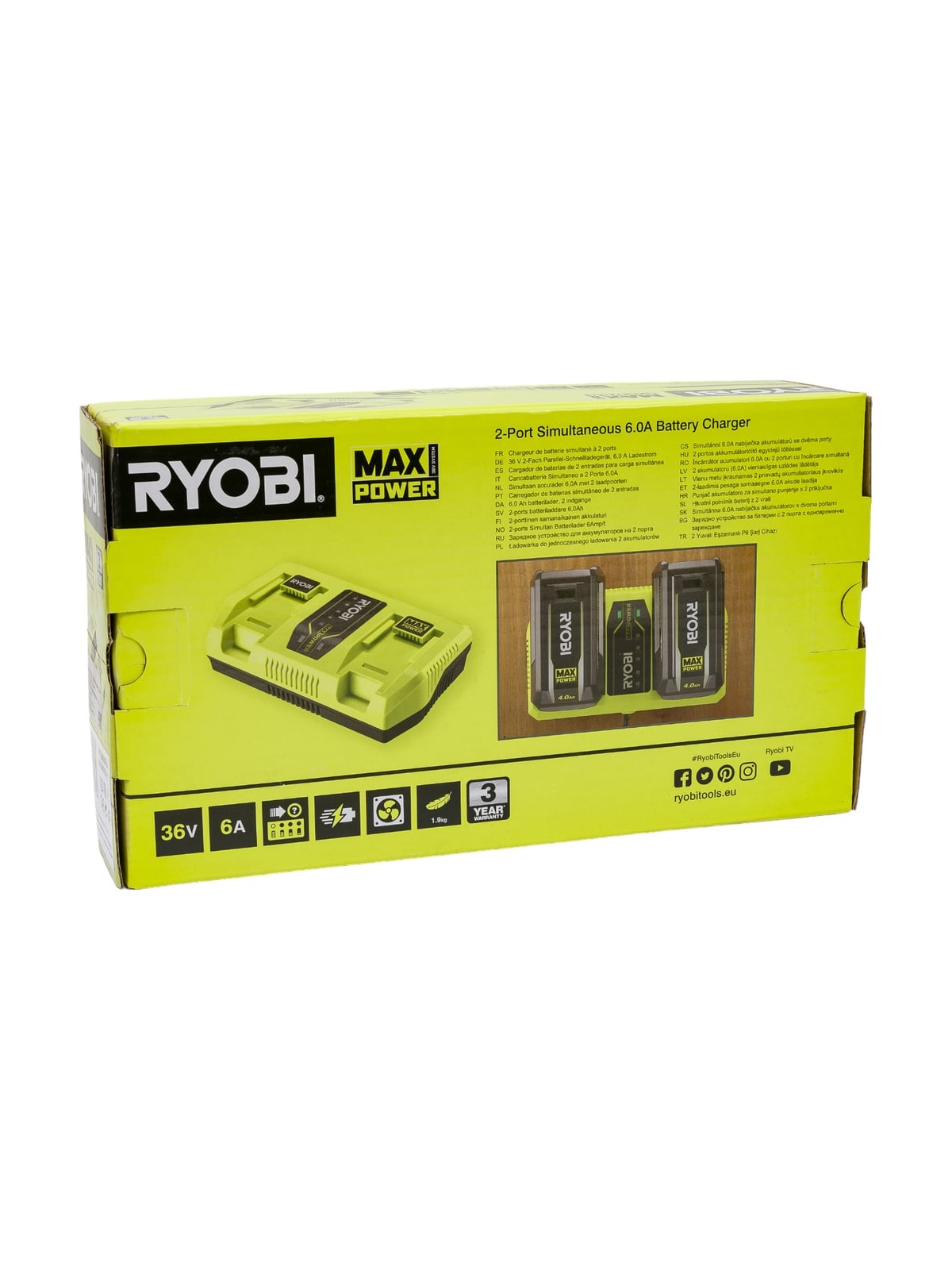 Зарядное устройство RY36C2PA 36В Ryobi 5133005741 Двухпортовое устройство Ryobi незаменимо, когда нужно быстро зарядить два аккумулятора. Совместимо с любым аккумулятором MAX POWER Светодиодный индикатор зарядного устройства информирует о состоянии аккумулятора и статусе процесса зарядки Вентилятор охлаждения позволяет зарядному устройству работать на максимальной мощности Одновременная зарядка двух аккумуляторов с силой тока 6А Крепление для подвешивания