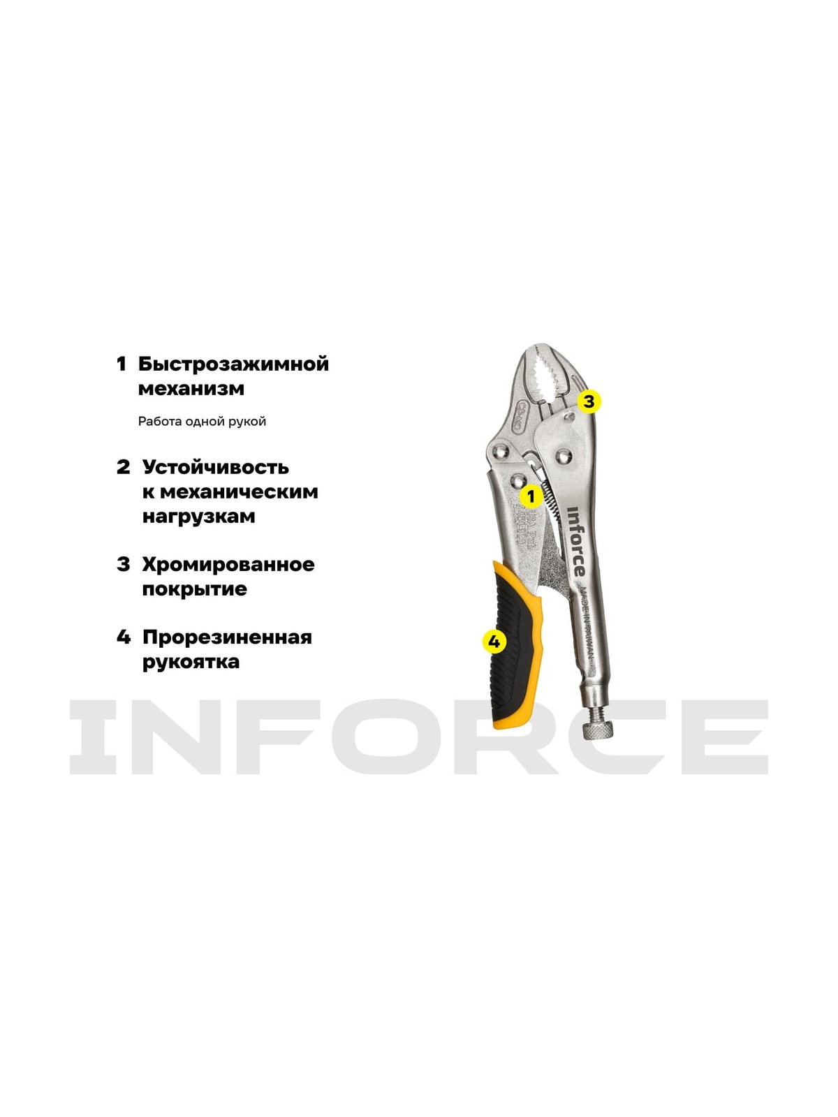 Зажимные клещи 175мм Inforce 06-03-01 подойдут для работы слесаря или мастера по кузовным работам. Благодаря большому захвату инструмент легко соединит между собой две детали перед их сваркой или иным соединением. Прочная хромомолибденовая сталь устойчива к ударам и деформациям.