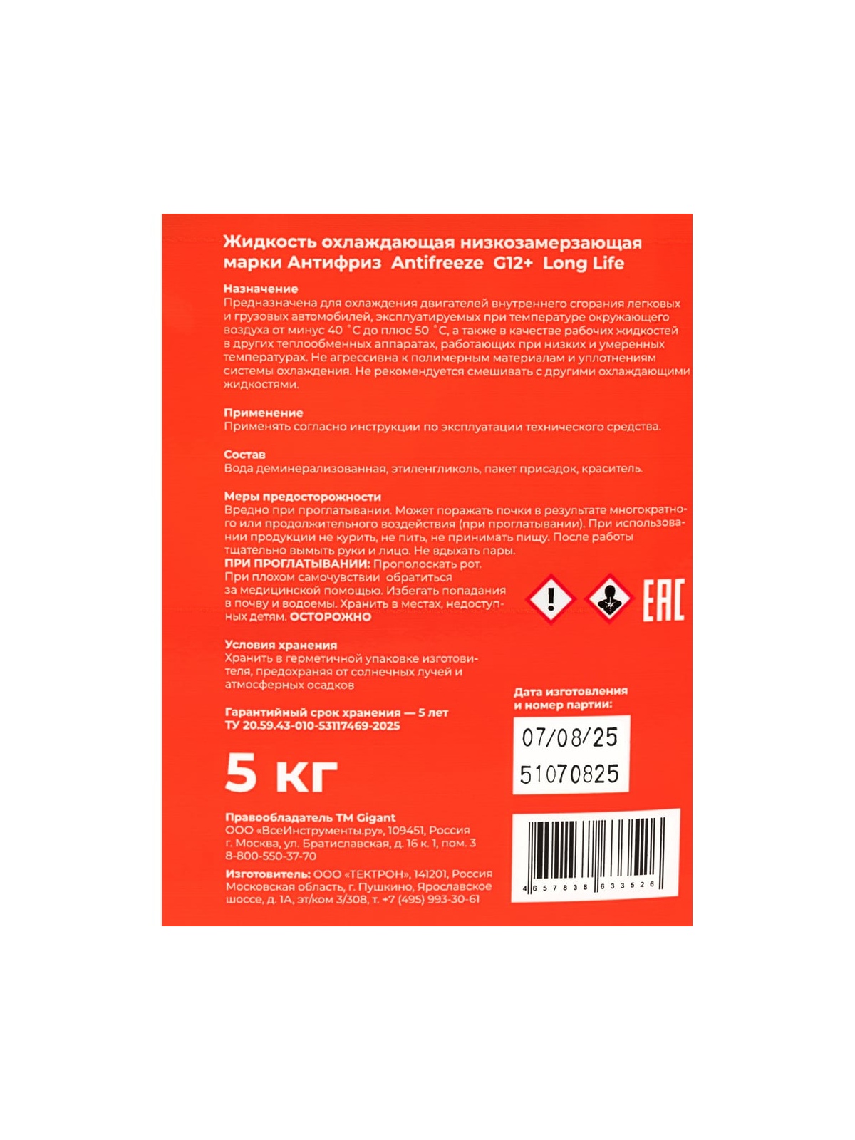 Жидкость охлаждающая низкозамерзающая марки Антифриз Antifreeze G12+ Long Life, 5кг., Gigant GAR-125 - это высококачественное решение для защиты двигателей от замерзания и перегрева. Благодаря основе из моноэтиленгликоля, эта жидкость обеспечивает эффективную защиту в широком диапазоне температур, что делает ее идеальным выбором для использования в различных условиях. Красный цвет жидкости облегчает ее идентификацию, а объем 5 литров позволяет обеспечить длительную защиту двигателя.
